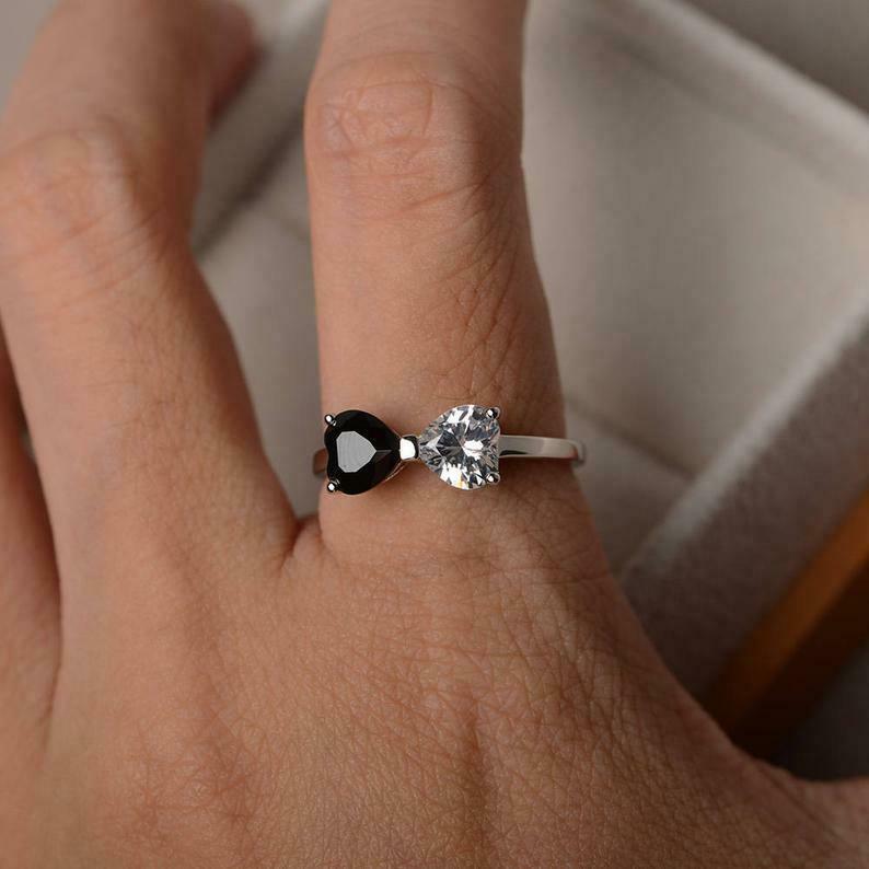 1ct Heart Cut Black & White Diamond Bow Shape Love Gift Ring 14k White Gold Over