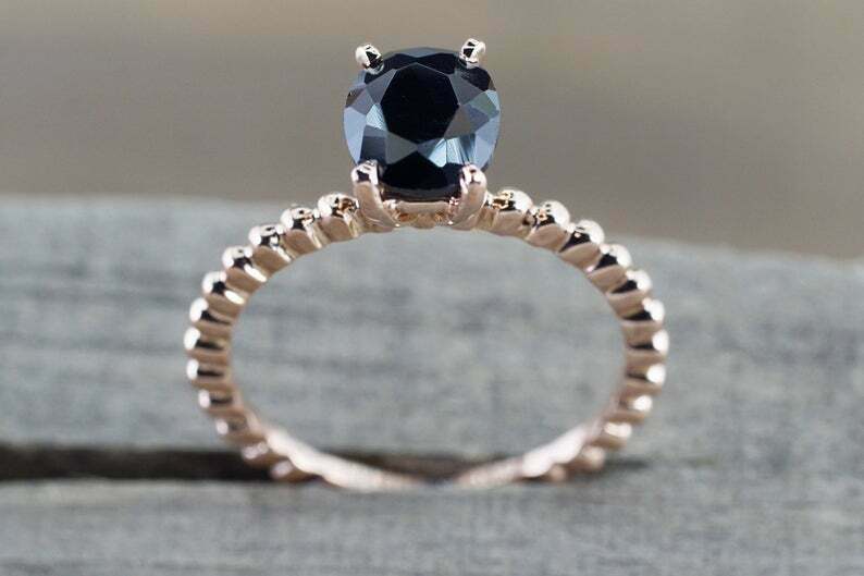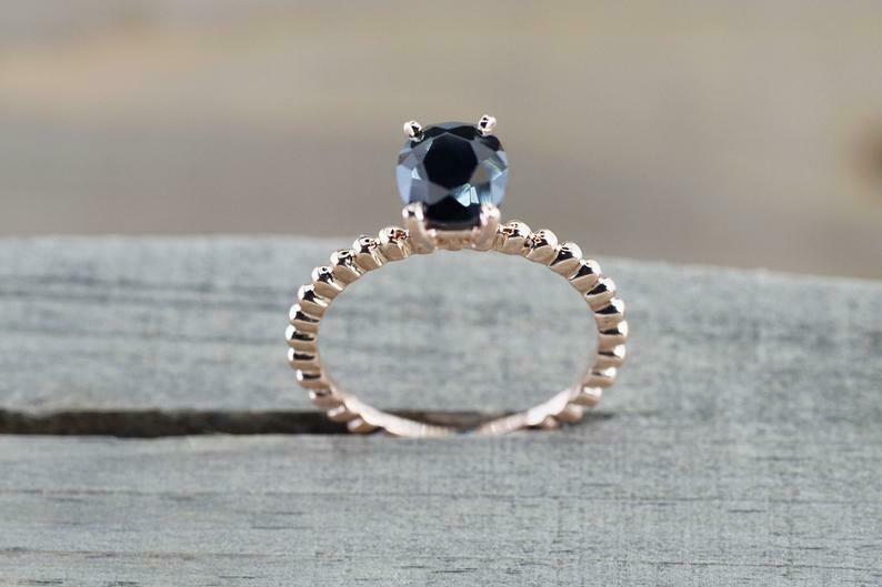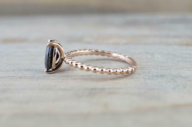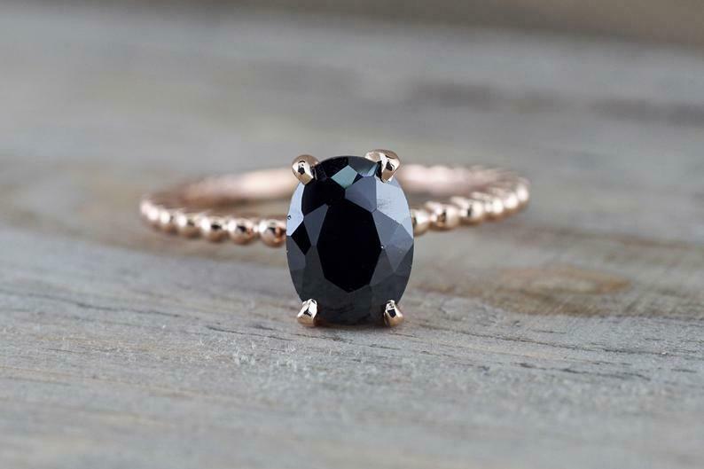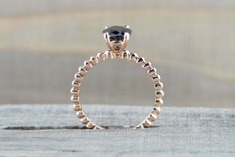 1ct Oval Cut Black Diamond Engagement Ring Beaded Solitaire 14k Rose Gold Finish