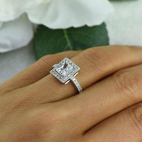 1ct Radiant Cut Diamond Vintage Rectangle Engagement Ring 14k White Gold Finish