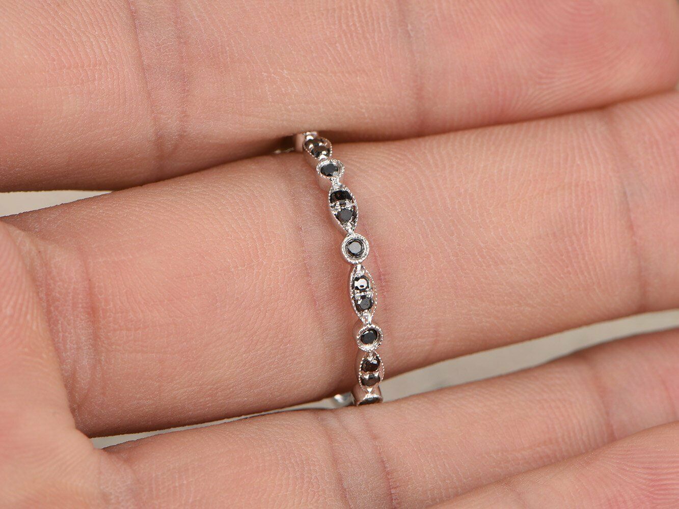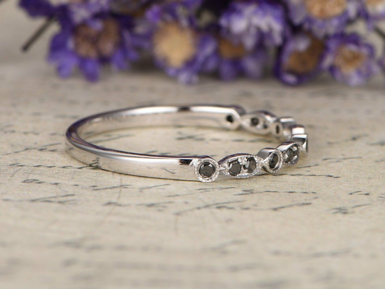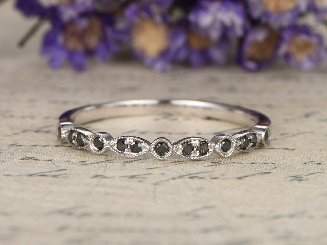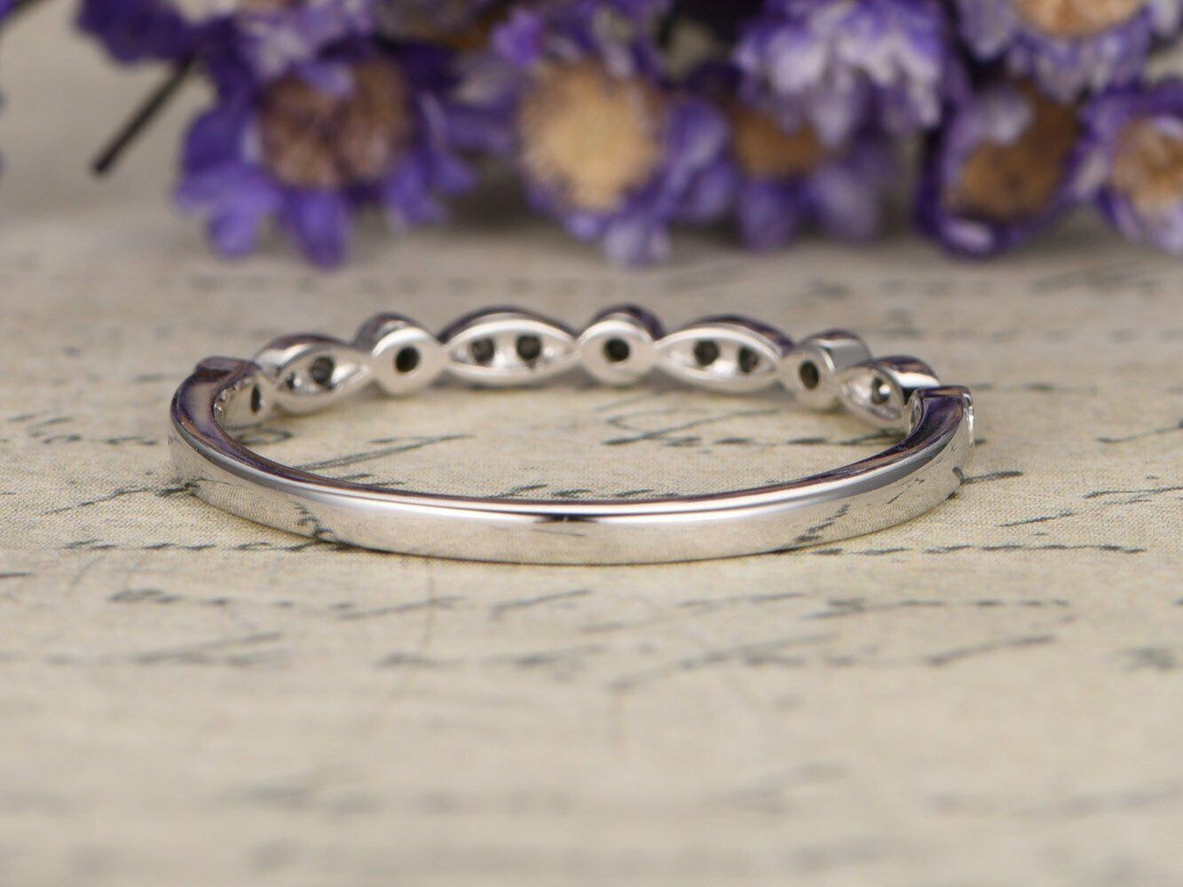 1Ct Round Cut Black Diamond Thin Minimalist Wedding Band 14K White Gold Finish