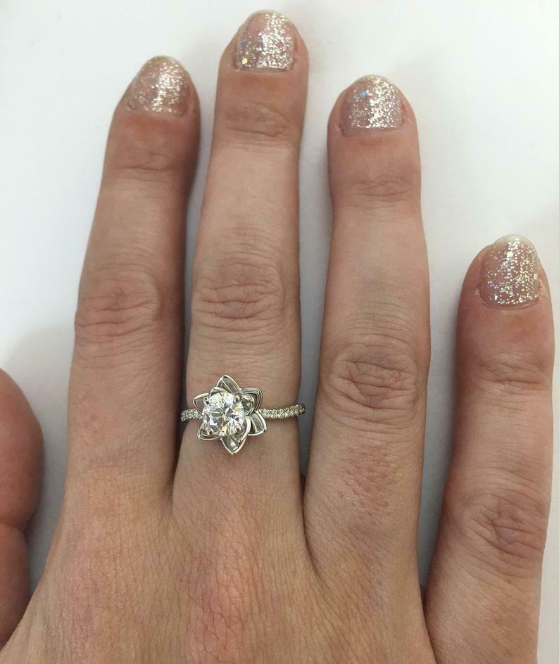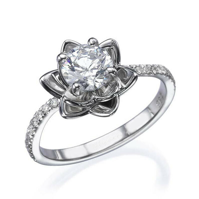 1ct Round Diamond Engagement Ring Flower Solitaire Accent 14k White Gold Finish