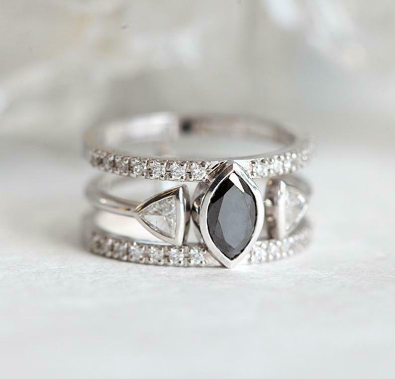 2.2ct Marquise Cut Black Diamond Double Band Ring Set 14k White Gold Finish