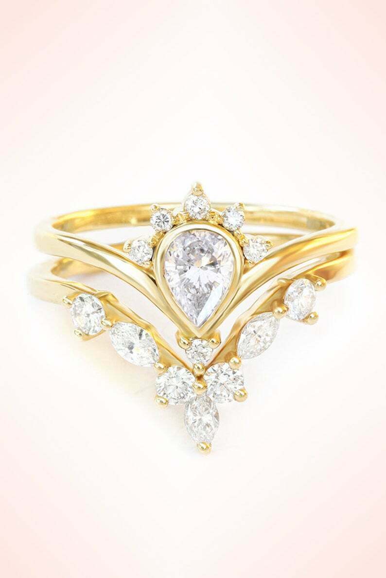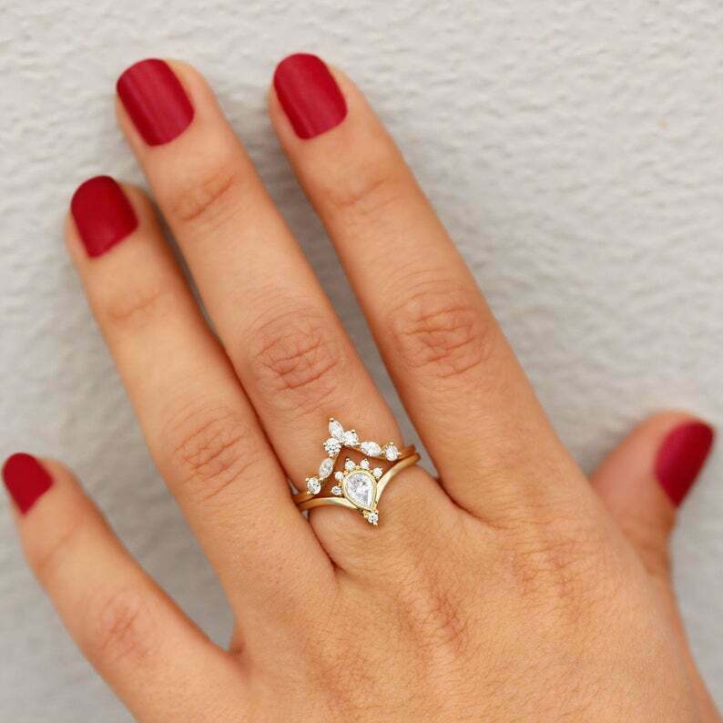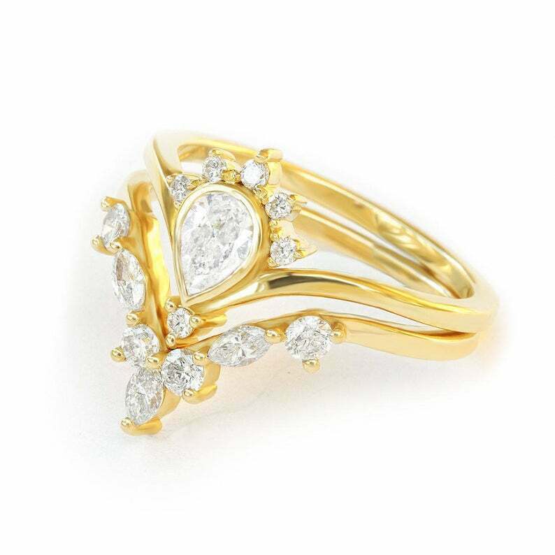 2.2ct Pear Cut Diamond Curved Chevron Crown Bridal Set Ring 14k Yellow Gold Over