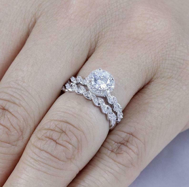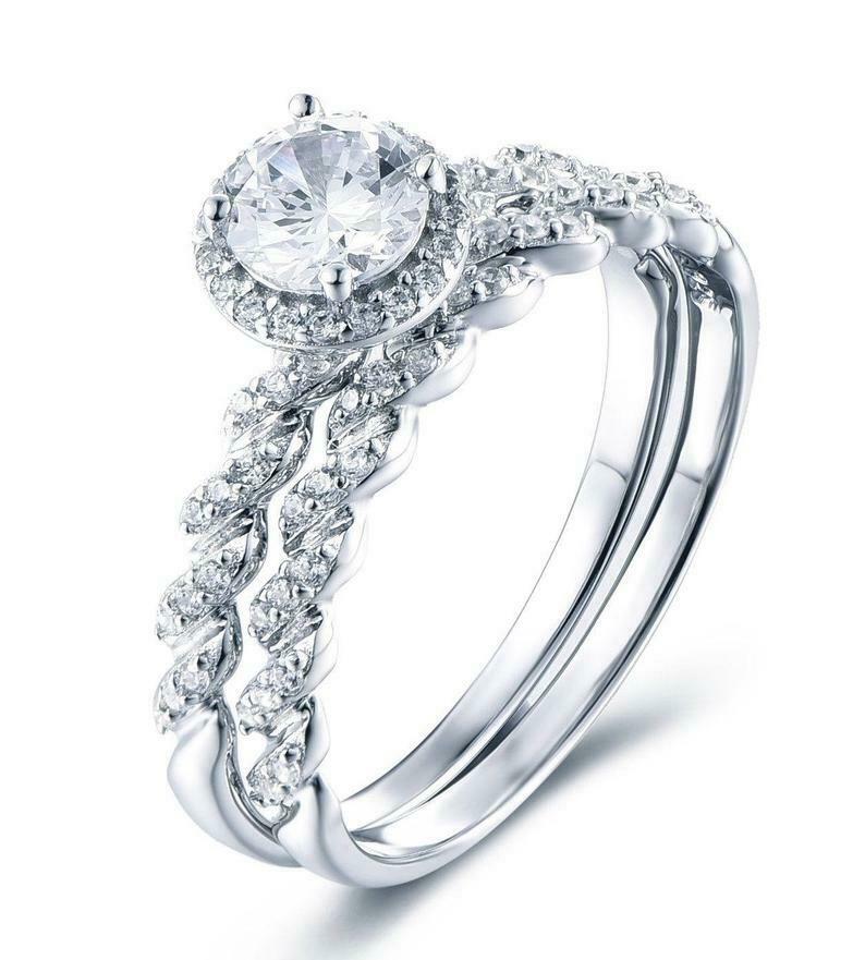 2.3ct Round Cut Diamond Bridal Set Halo Ring Twisted Band 14k White Gold Finish