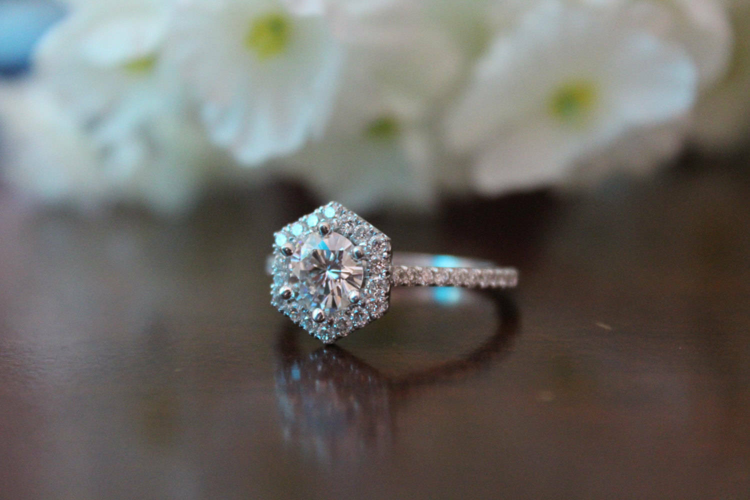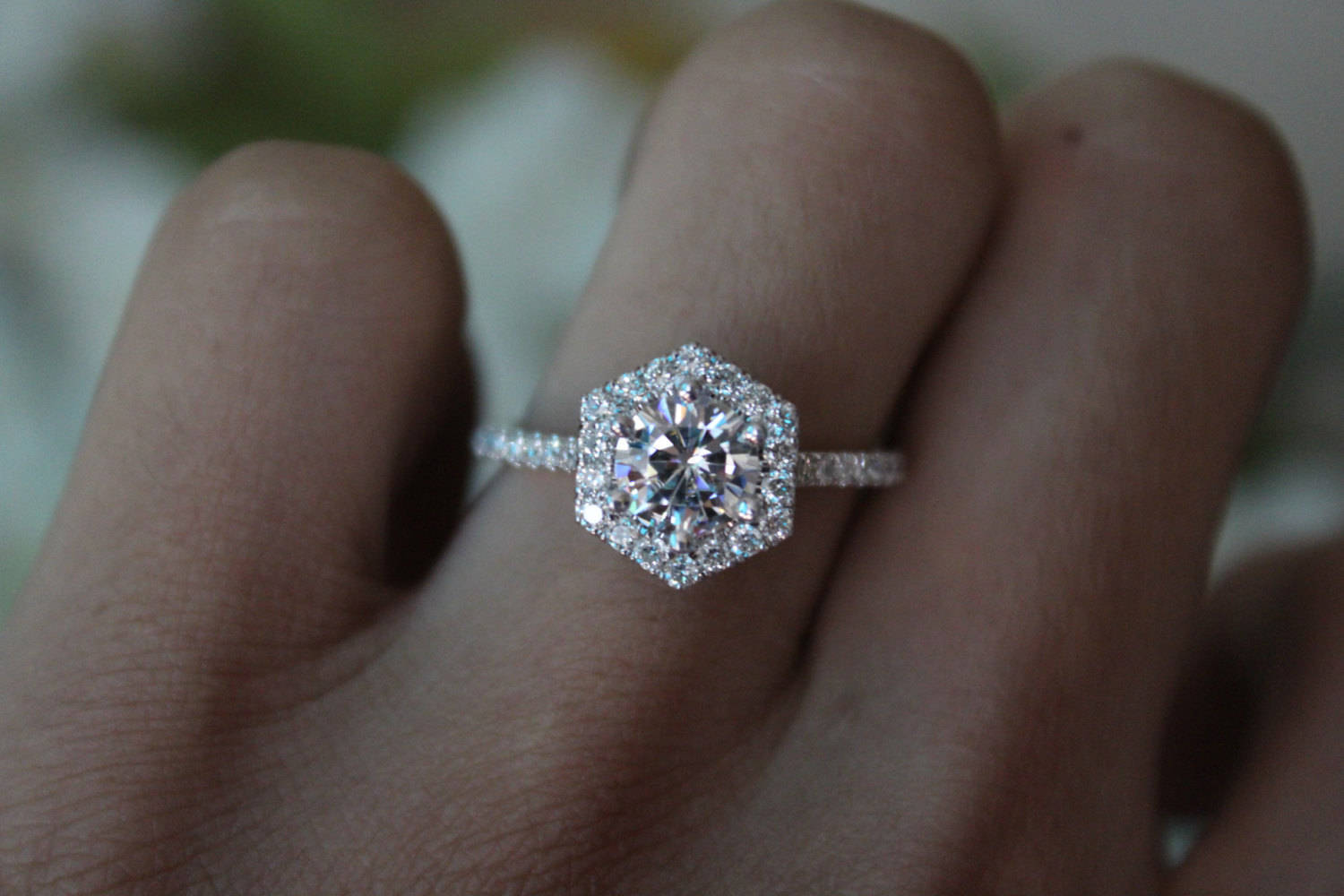 2.3ct Round Cut VVS1 Diamond Hexagon Halo Engagement Ring 14k White Gold Finish