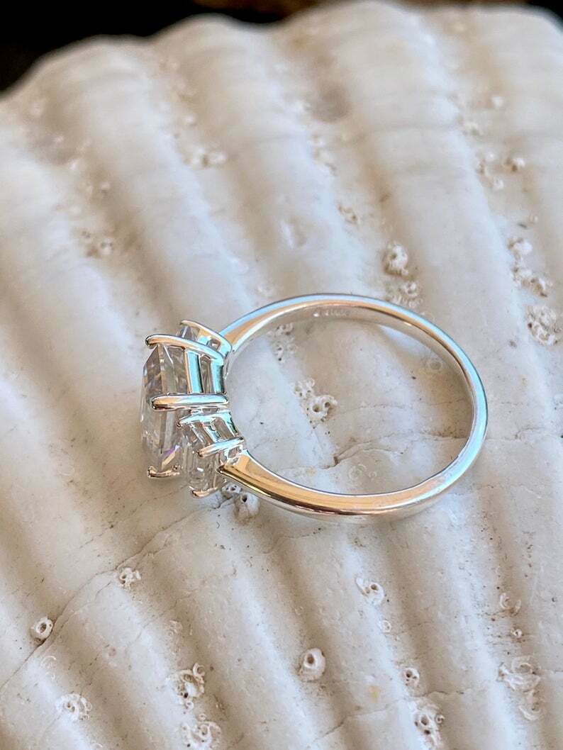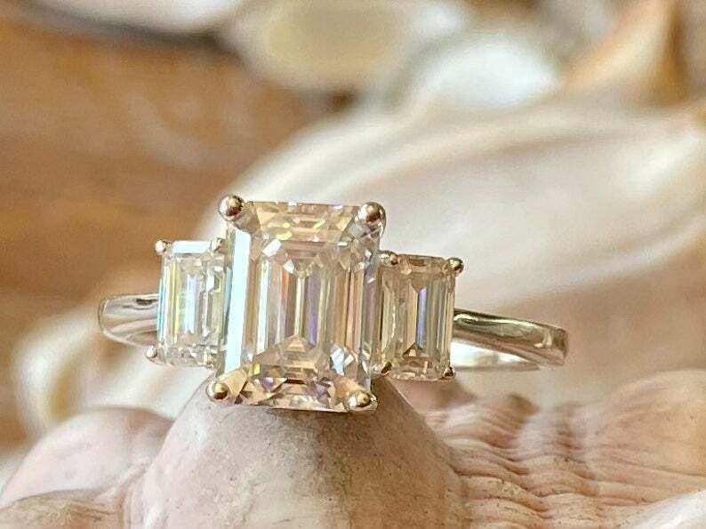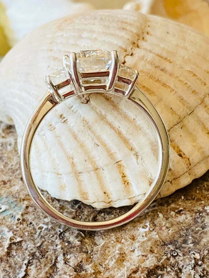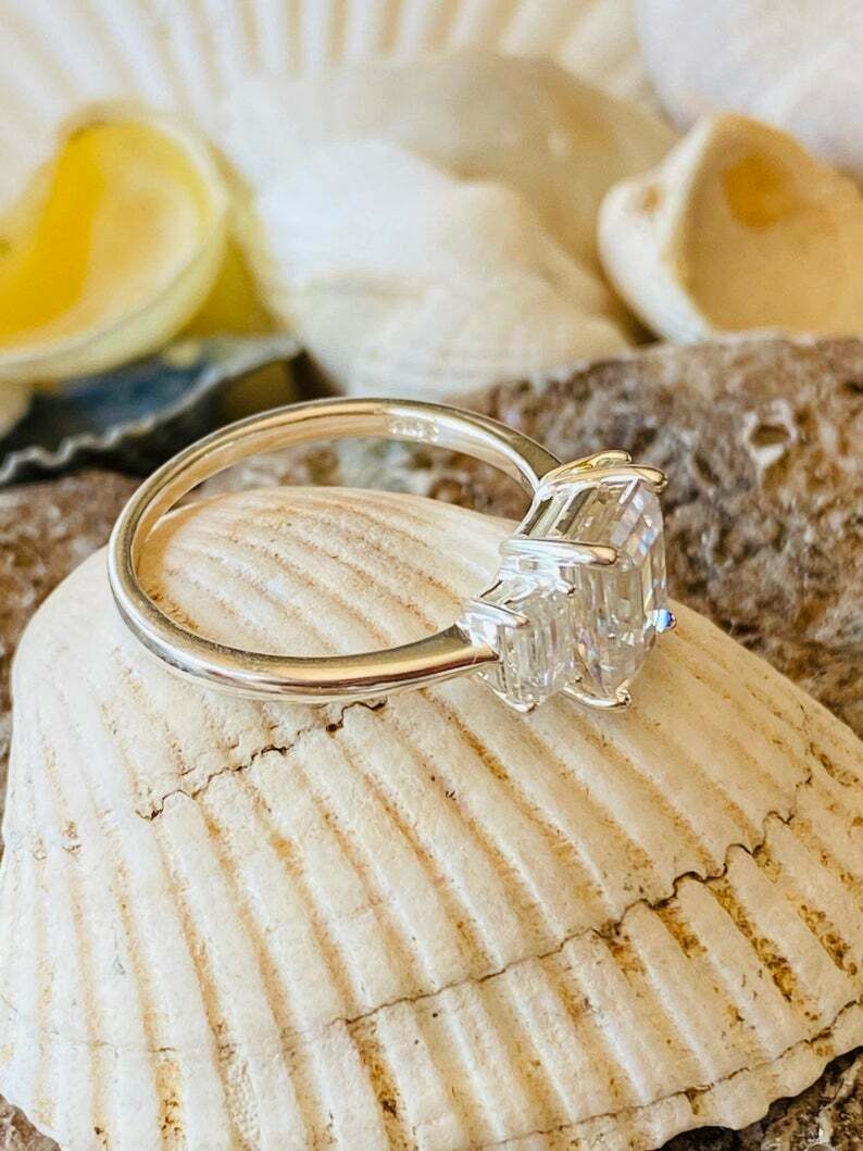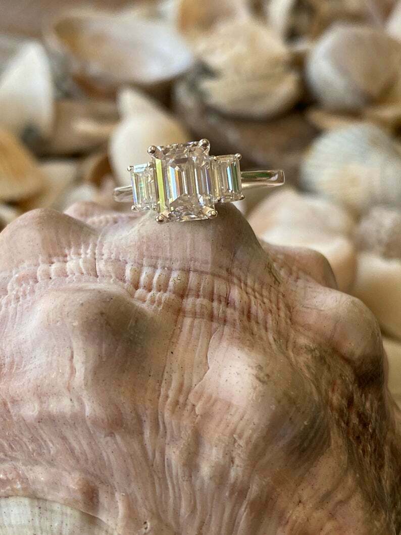 2.5ct Engagement Ring Emerald Cut Diamond Trilogy Solitaire 14k WhiteGold Finish