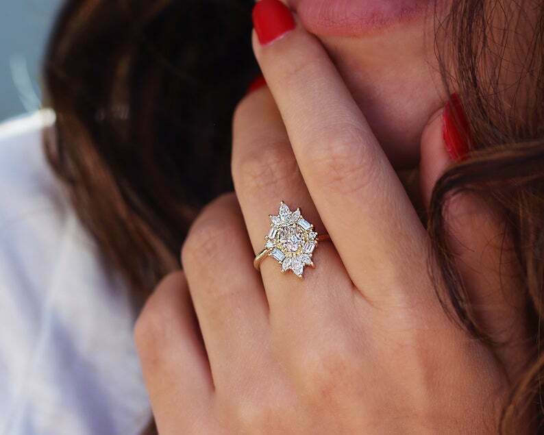 2.5ct Oval Diamond Engagement Ring Art Deco Vintage Inspired 14k Yellow Gold Over