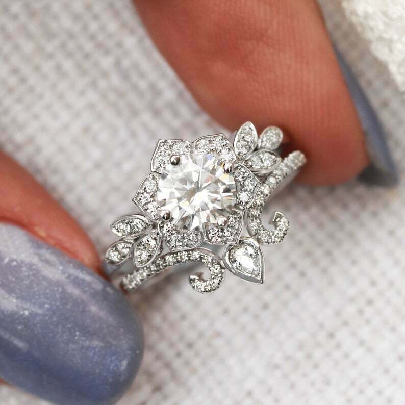 2.5ct Round Cut Diamond Engagement Ring Floral Bridal Set 14k White Gold Finish