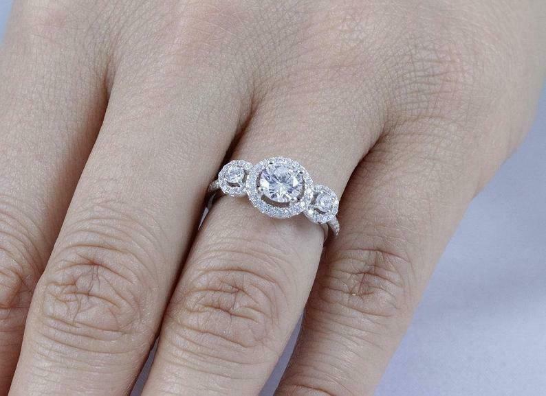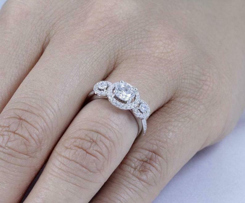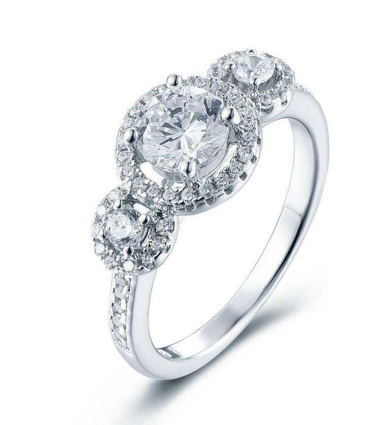 2.5ct Round Cut VVS1D Diamond Engagement Ring Halo Trilogy 14k White Gold Finish