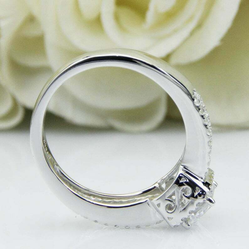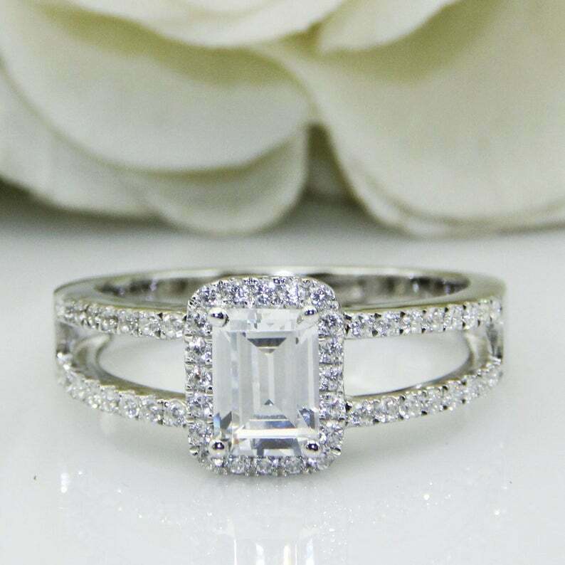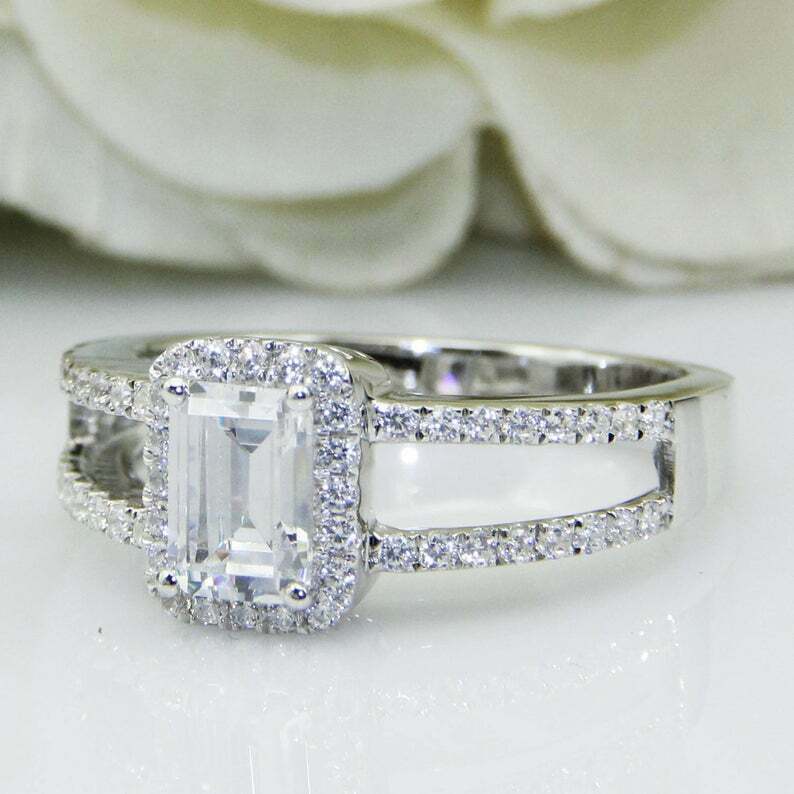 2.7ct Emerald Cut Diamond Engagement Ring Halo Split Shank 14k White Gold Finish