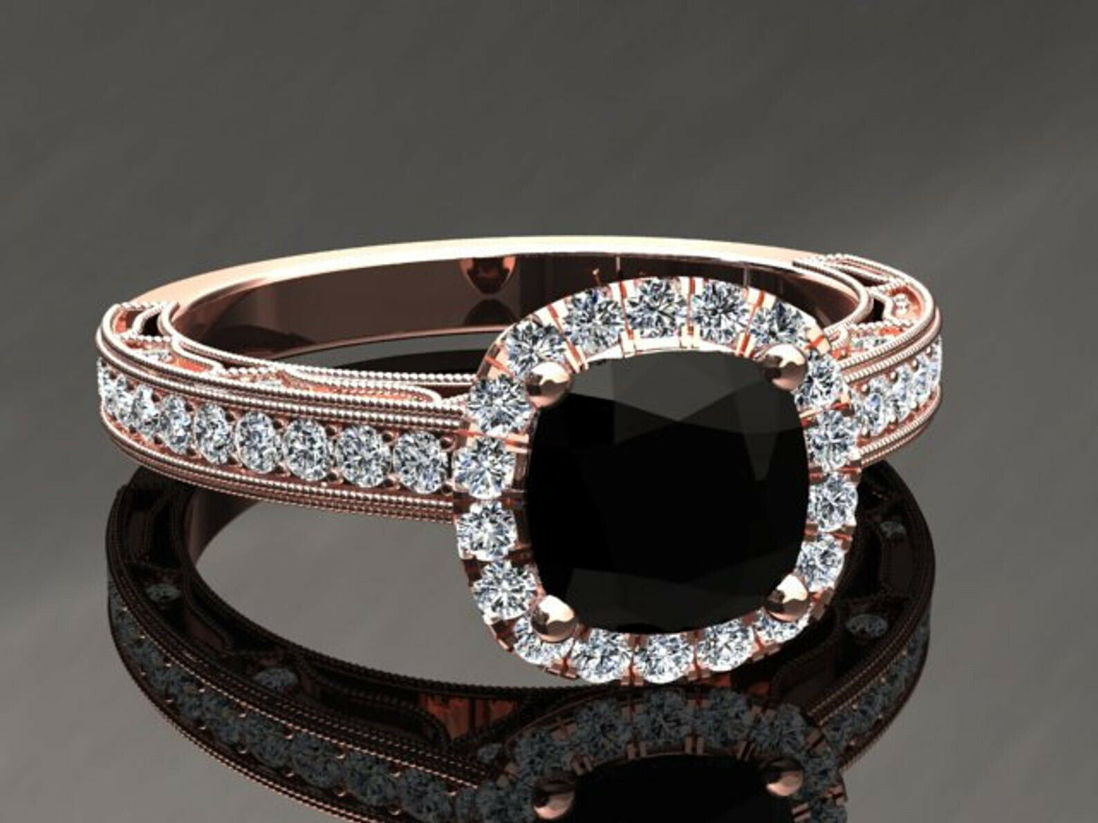 2ct Cushion Black Diamond Engagement Ring Milgrain Accent Halo 14k RoseGold Over