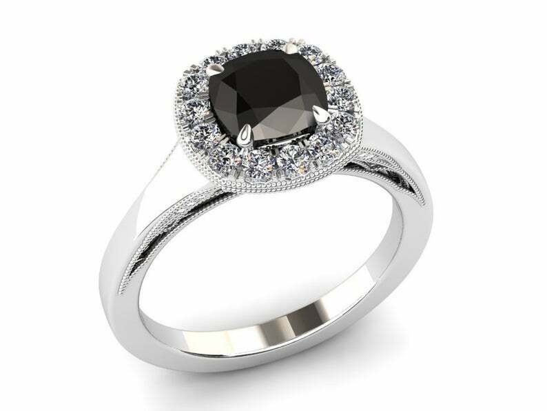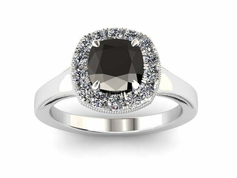 2ct Cushion Cut Black Diamond Engagement Ring Milgrain Halo 14k WhiteGold Finish