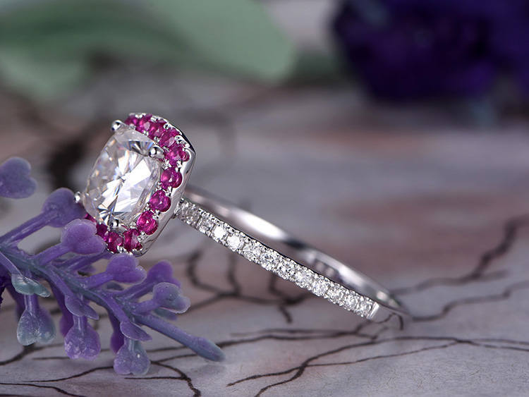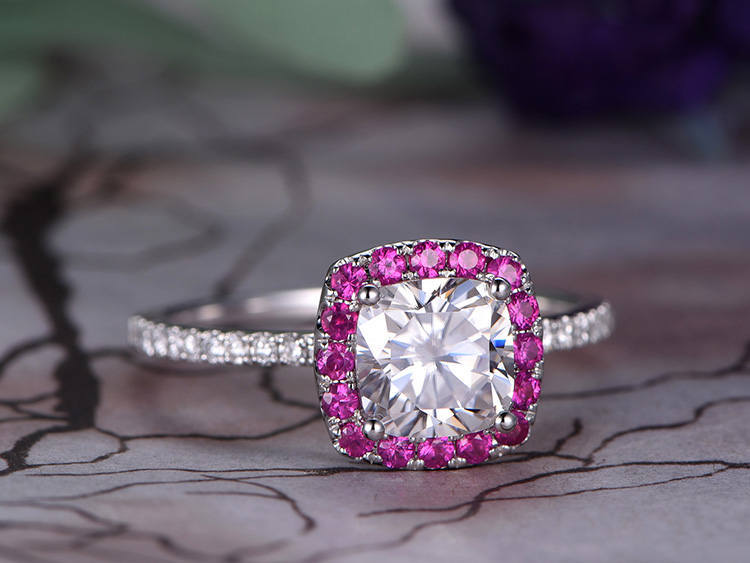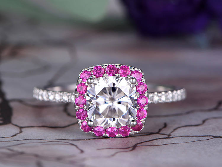 2ct Cushion Cut Diamond Engagement Ring Pink Sapphire Halo 14k White Gold Finish