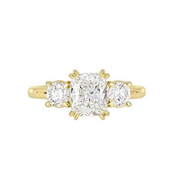 2Ct Cushion Cut Diamond Round Accent Trilogy Solitaire Ring 14K Yellow Gold Over