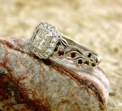 2Ct Cushion Cut Diamond Ruby Vintage Halo Engagement Ring 14K White Gold Finish