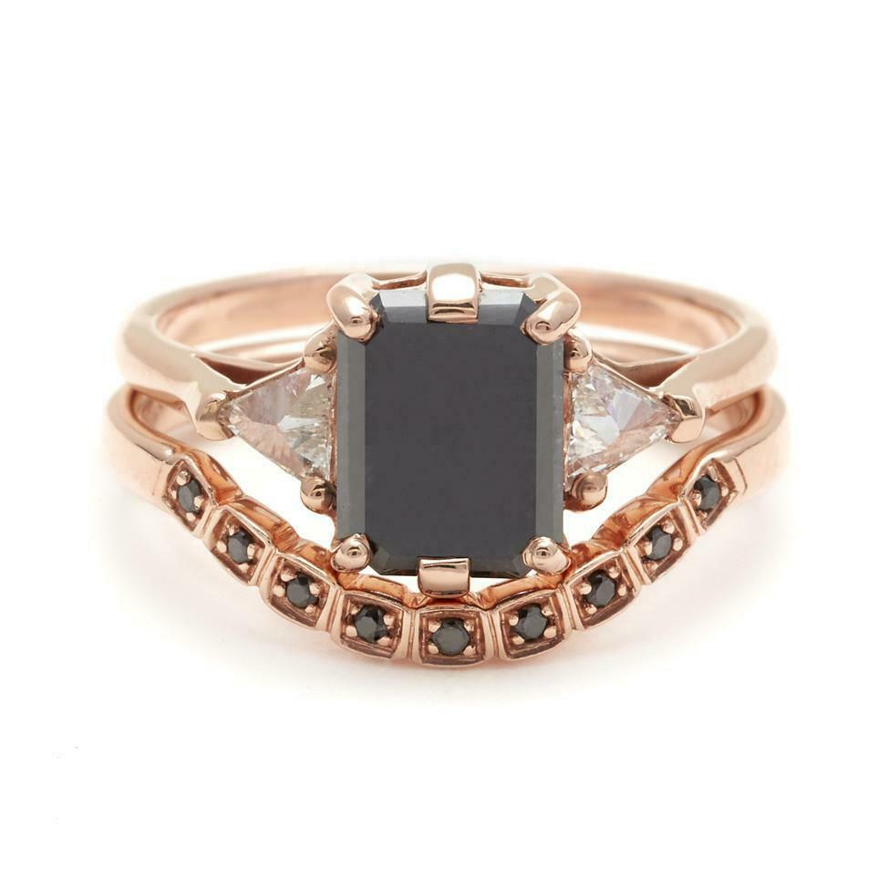 2ct Emerald Black Diamond Engagement Ring 14k Rose Gold Finish Curved Bridal Set