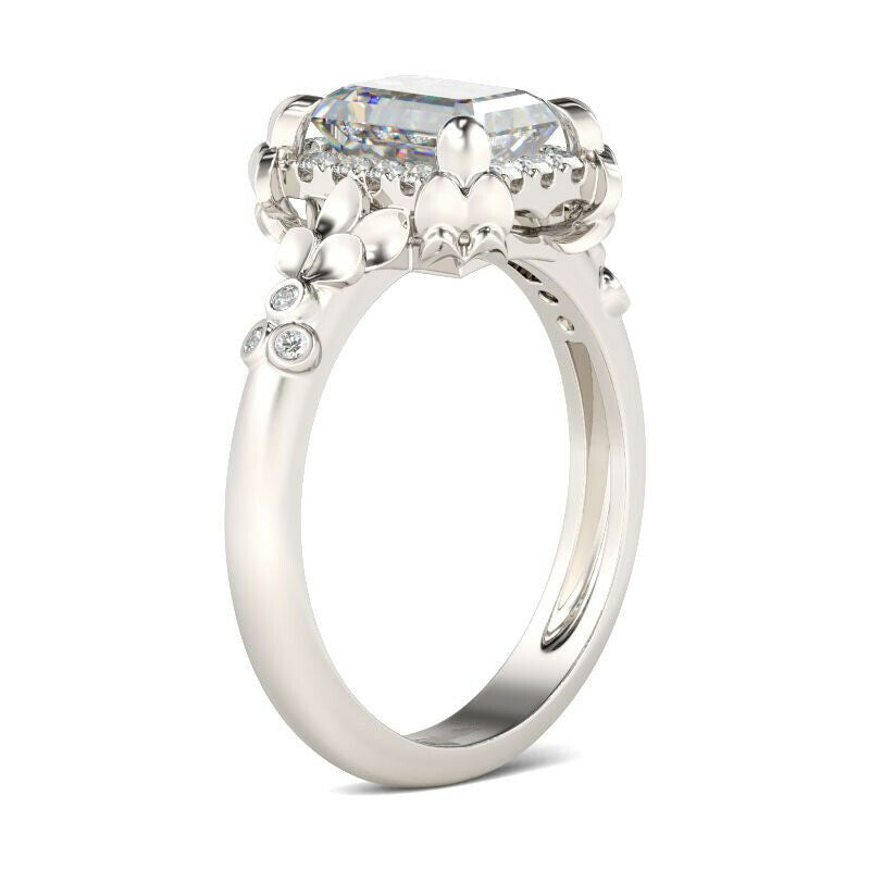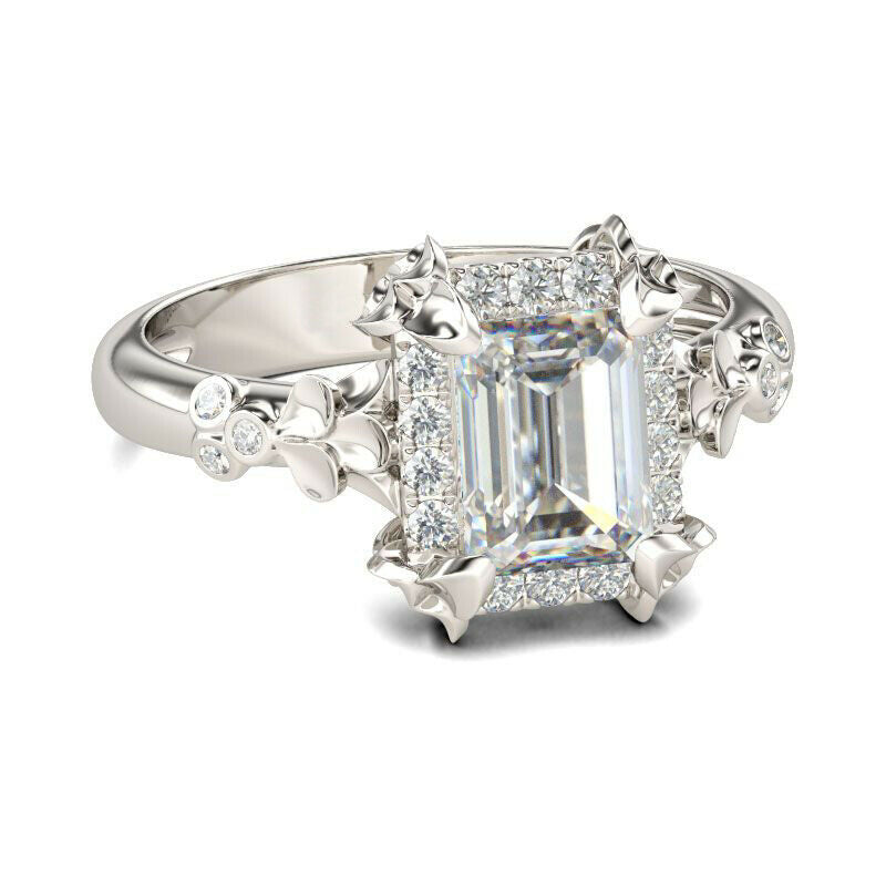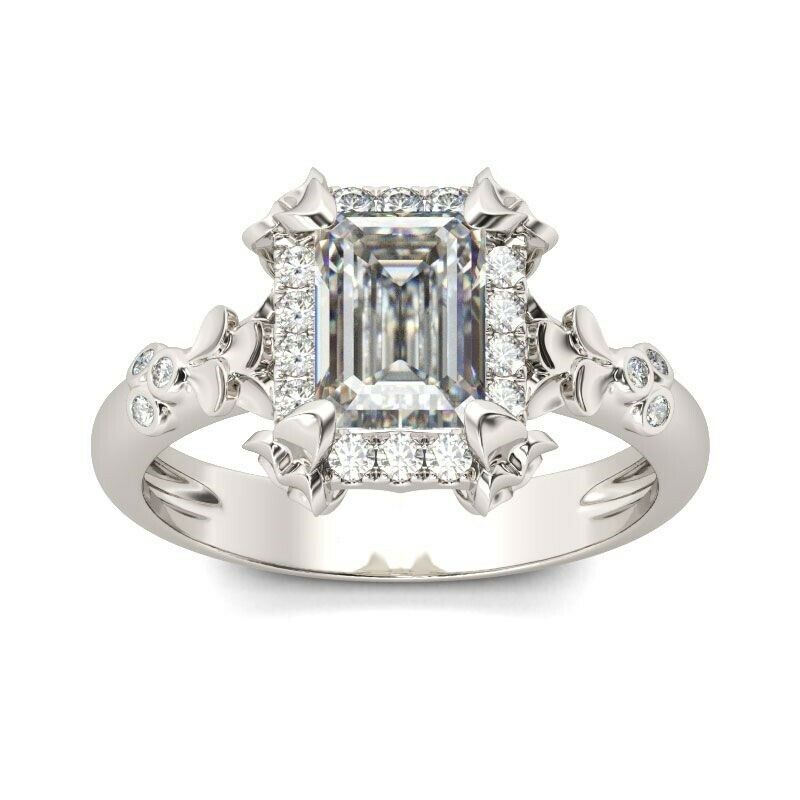 2Ct Emerald Cut Diamond Leaf Inspired Halo Engagement Ring 14K White Gold Finish