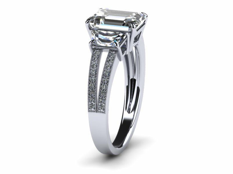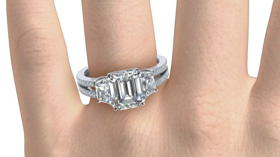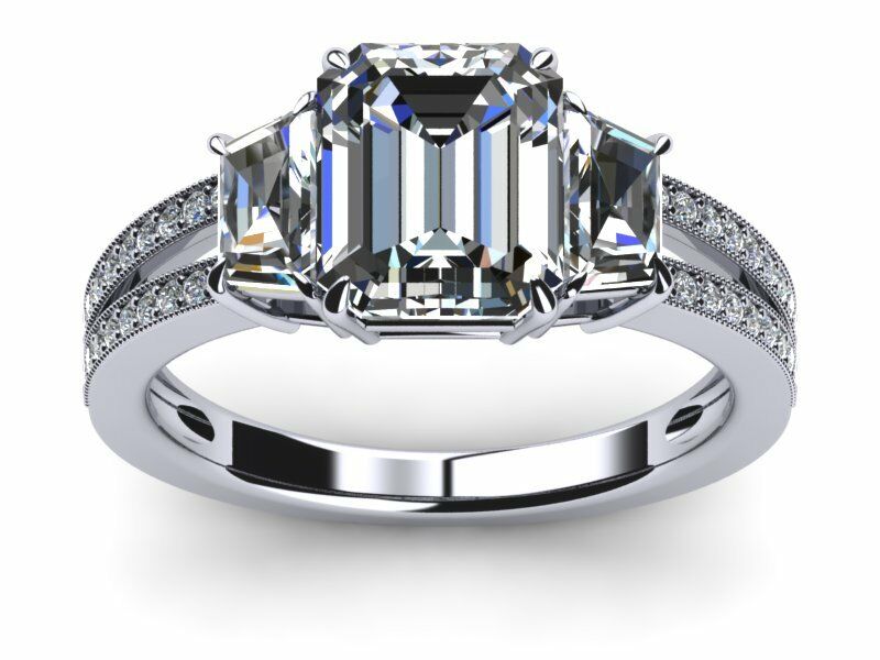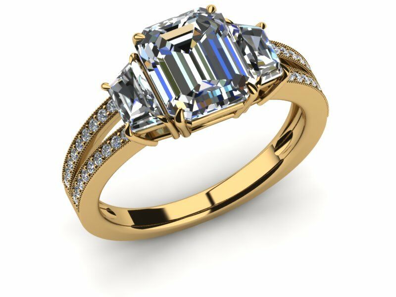 2ct Emerald Cut Three Stone Milgrain Split Band Engagement Ring 14k Gold Finish