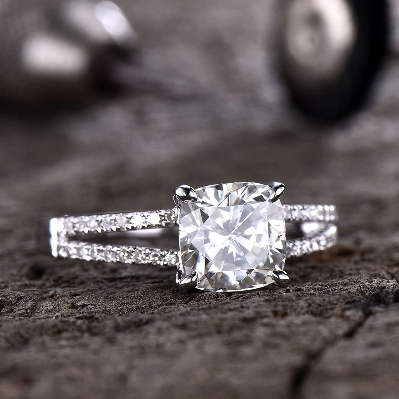 2ct Engagement Ring Cushion Cut Diamond Split Shank Design 14k White Gold Finish