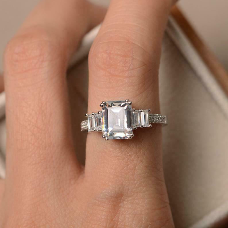 2ct Engagement Ring Emerald Cut Diamond Solitaire with Accents 14k White Gold Finish