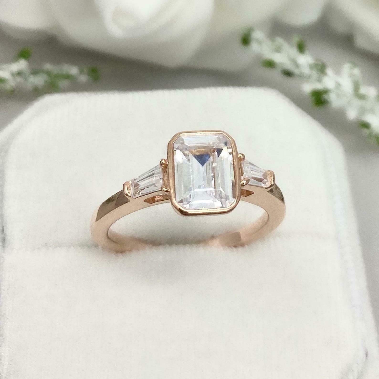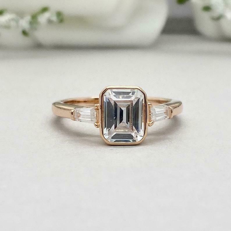 2ct Engagement Ring Emerald Cut Diamond Three Stone Design 14k Yellow Gold Finish
