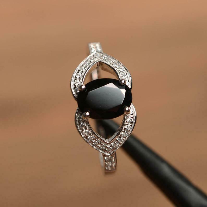 2ct Engagement Ring Oval Cut Black Diamond Hollow Leaf Halo 14k White Gold Finish