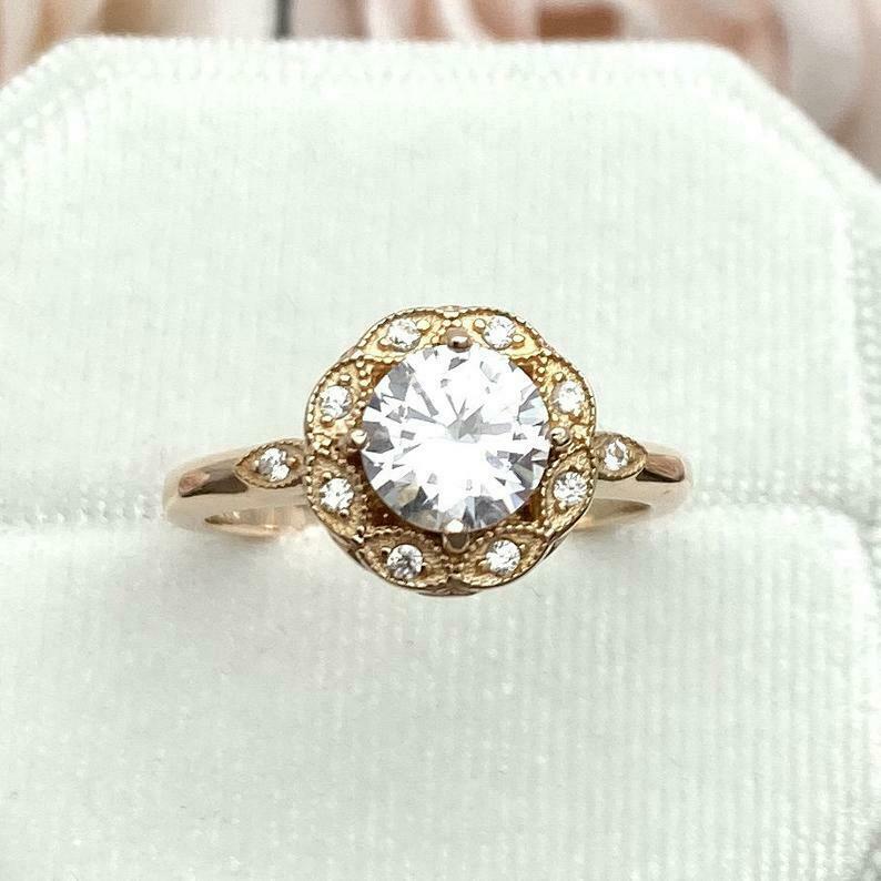 2ct Engagement Ring Round Cut Diamond Floral Milgrain Halo 14k Yellow Gold Finish
