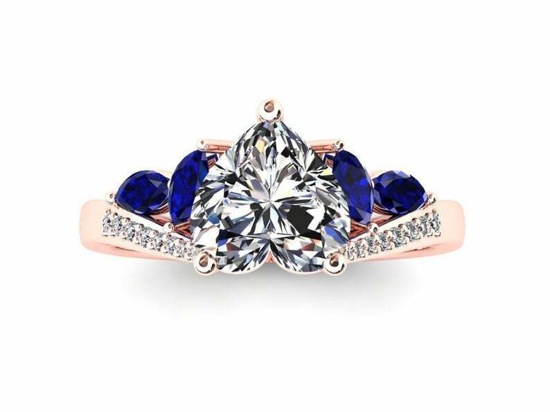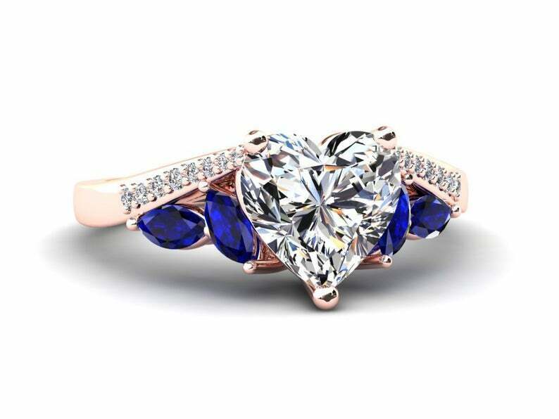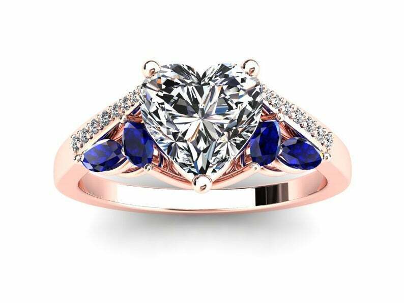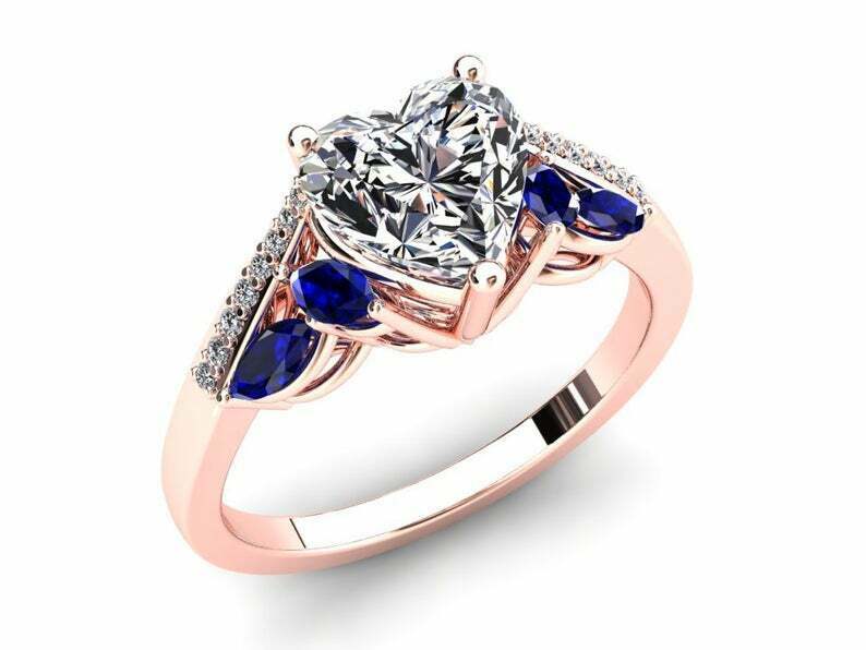 2ct Heart Cut Diamond Art Deco Sapphire Accent Engagement Ring 14k Rose Gold Over