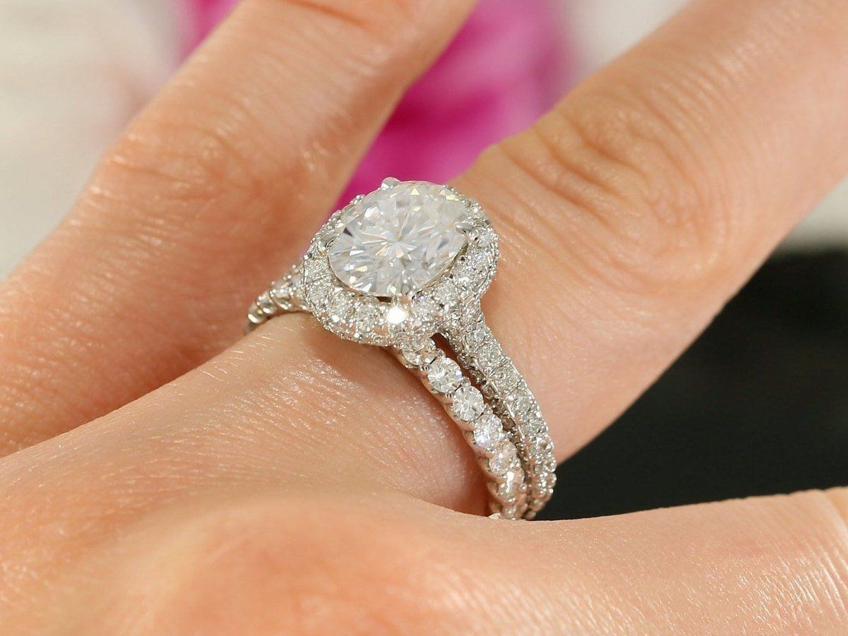 2ct Oval Cut VVS1 Diamond Halo Bridal Set Engagement Ring 14k White Gold Finish