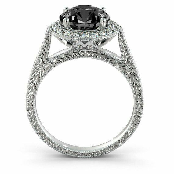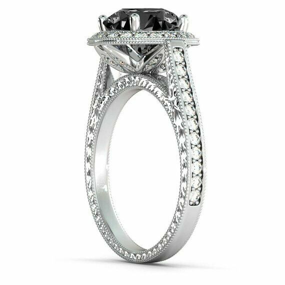 2ct Round Cut Black Diamond Vintage Halo Engagement Ring 14k White Gold Finish