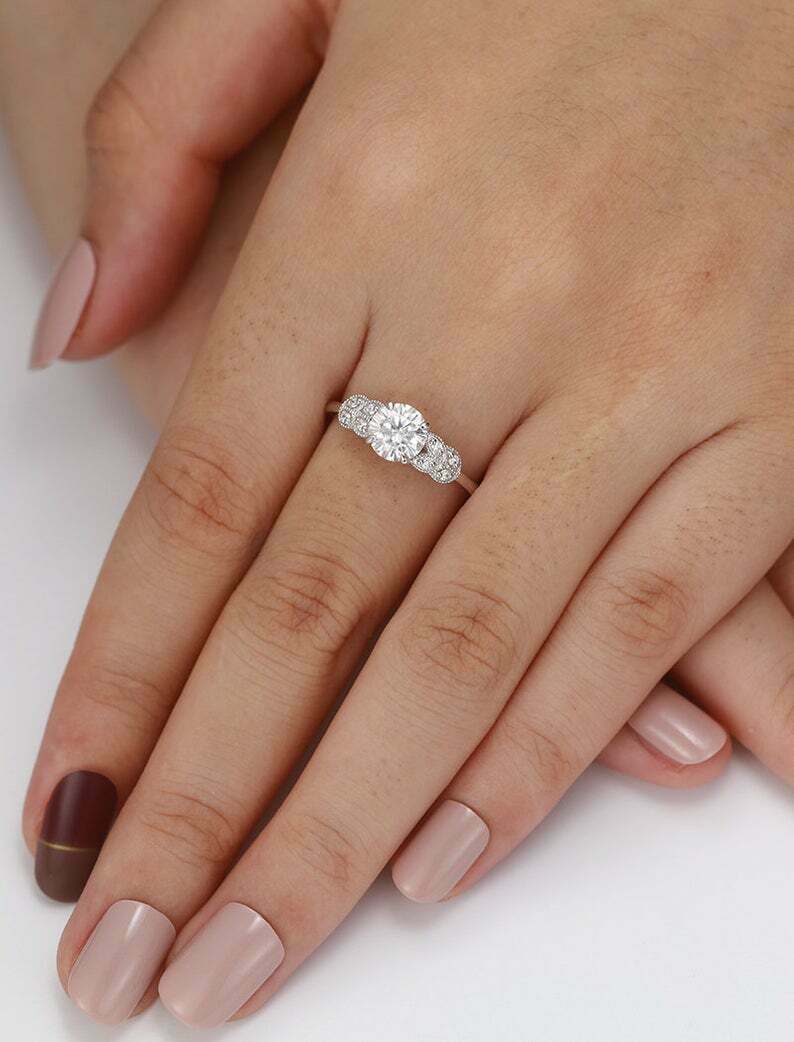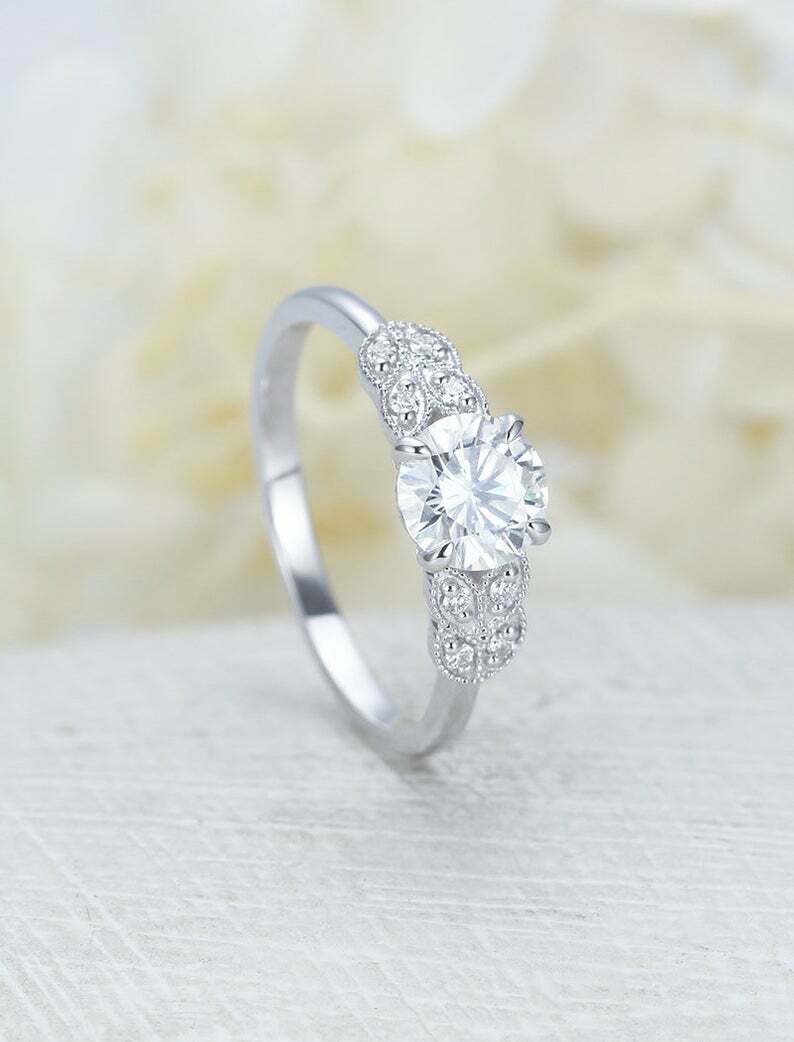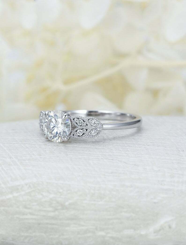 2ct Round Cut Diamond Engagement Ring Leaf Milgrain Accents 14k WhiteGold Finish