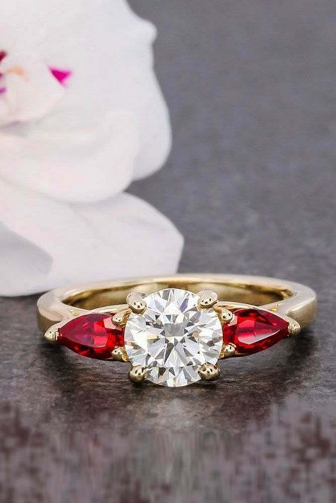 2Ct Round Cut Diamond Trilogy Engagement Ring 14K Yellow Gold Over Ruby Accents