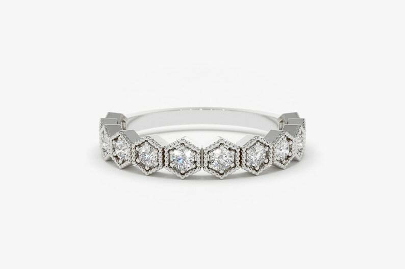 2ct Wedding Band Round Cut Diamond Milgrain Hexagon Shape 14k White Gold Finish