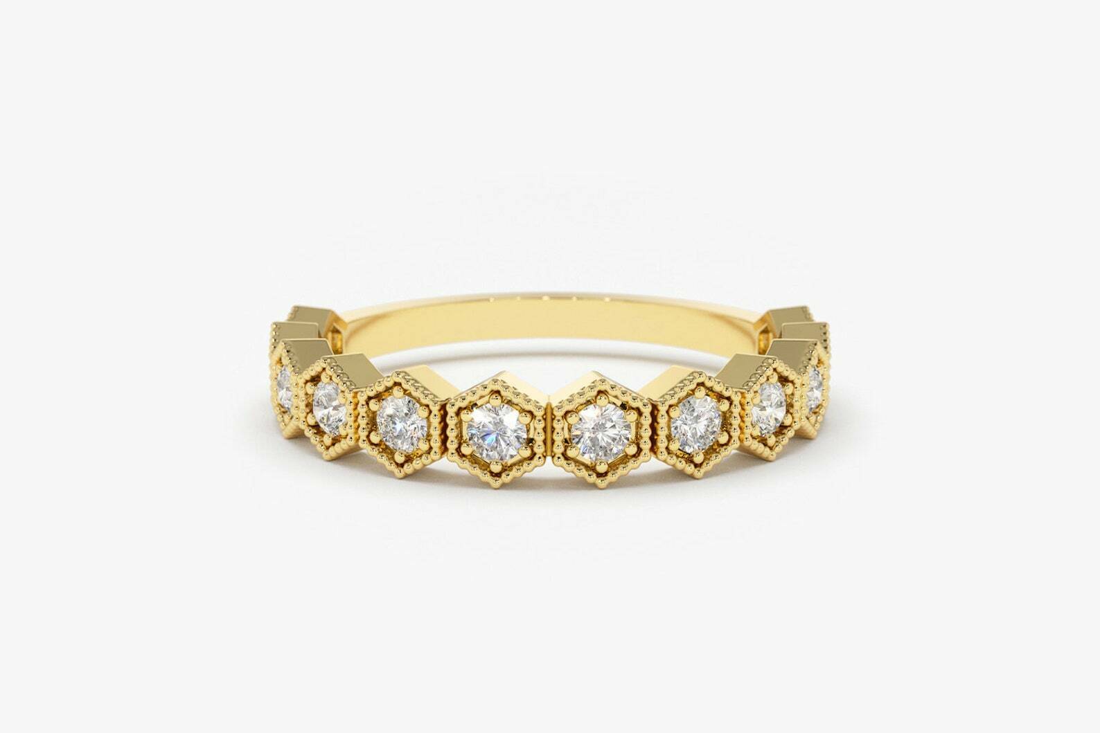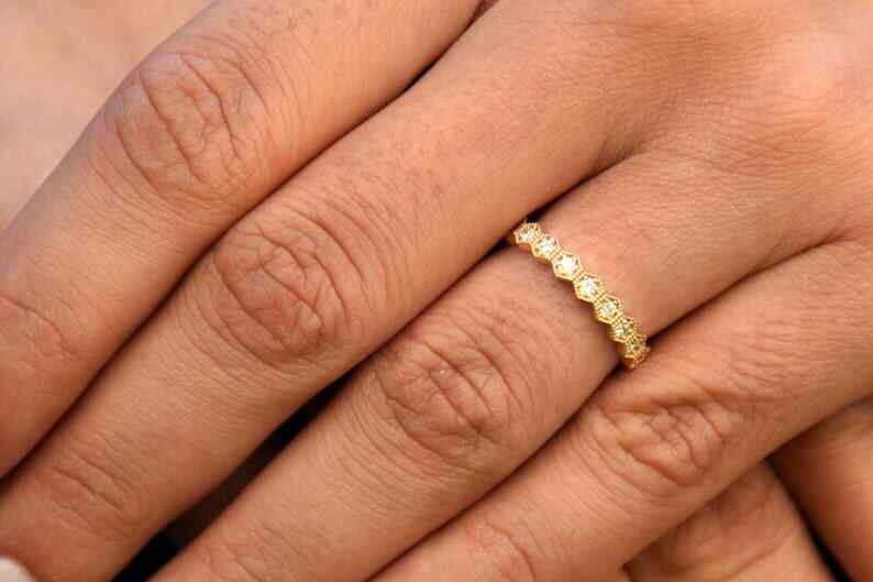 2ct Wedding Band Round Cut Diamond Milgrain Hexagon Shape 14k Yellow Gold Finish