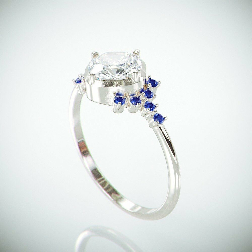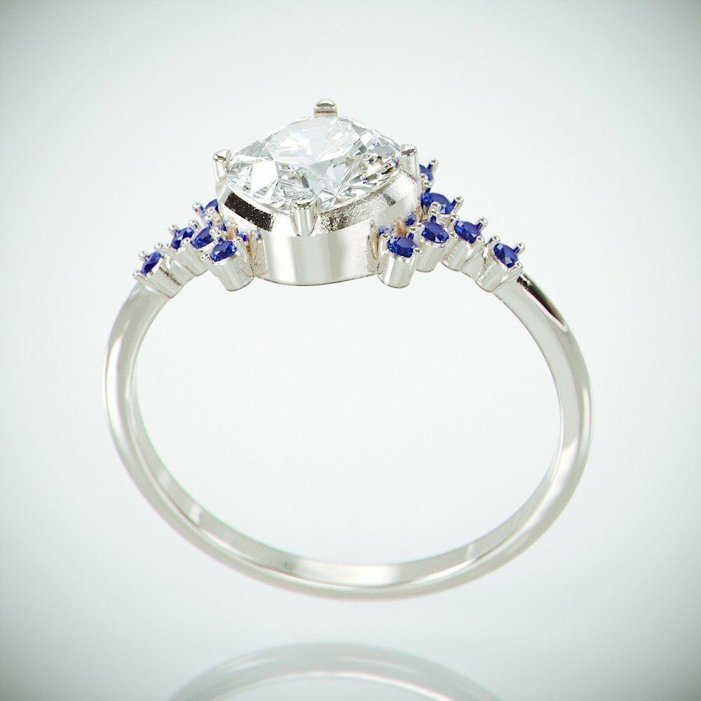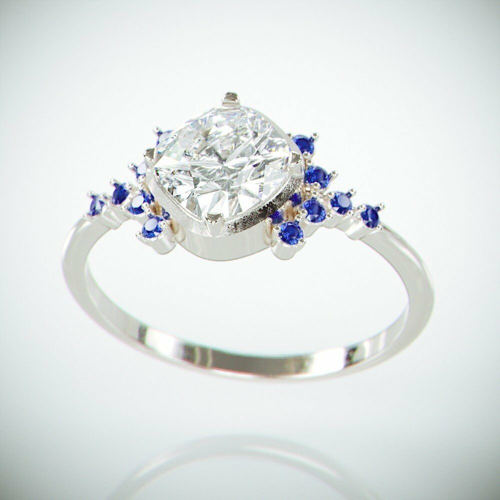 3Ct Cushion Cut Diamond Engagement Ring 14K White Gold Over Blue Sapphire Accent