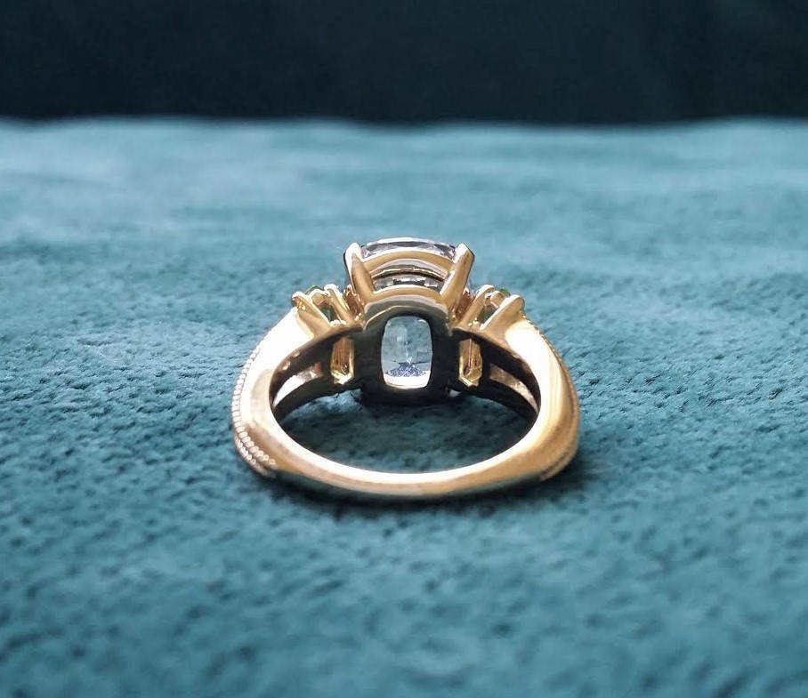 3Ct Cushion Cut Diamond Peridot Trilogy Engagement Ring 14K Rose Gold Finish