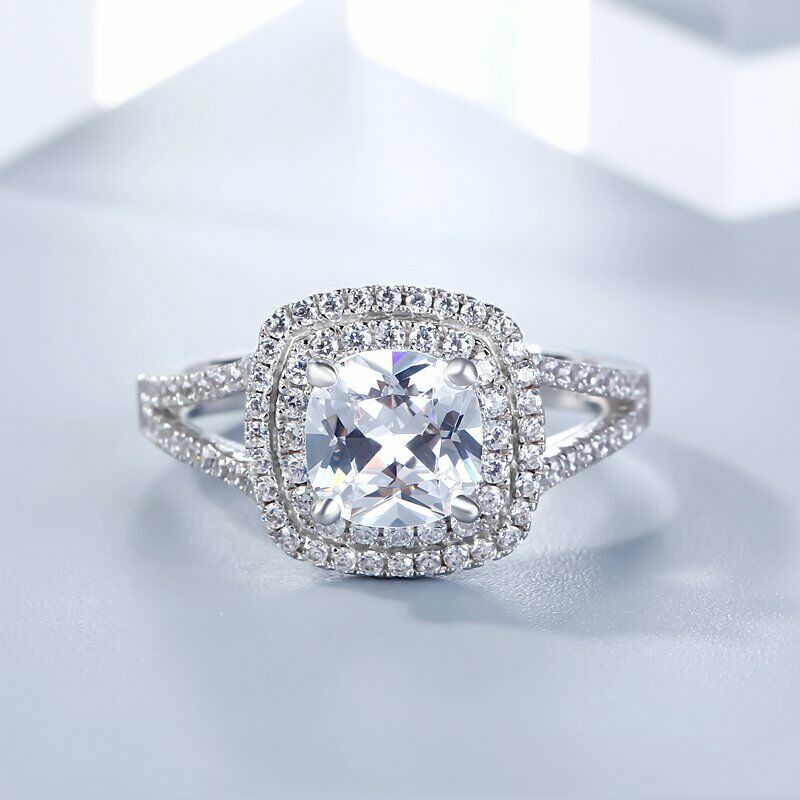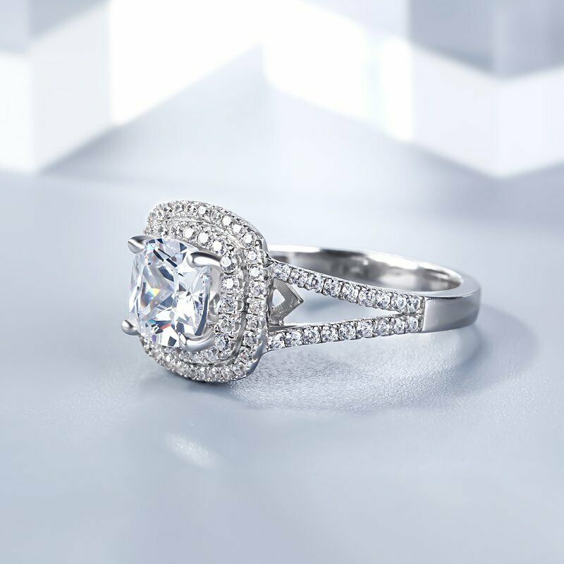 3Ct Cushion Cut Diamond Split Shank Engagement Halo Ring 14K White Gold Finish