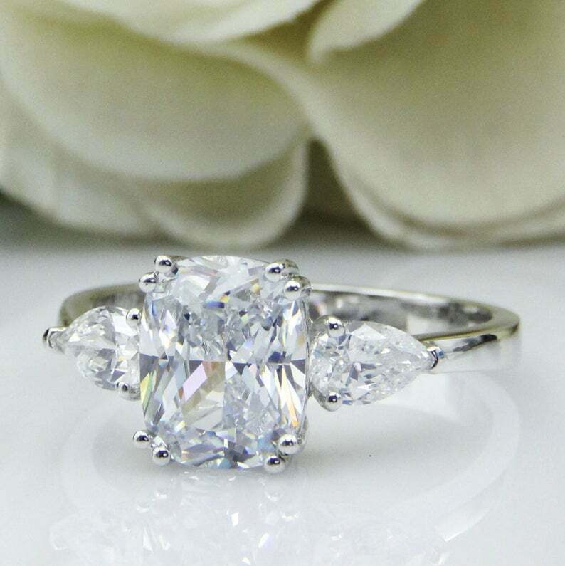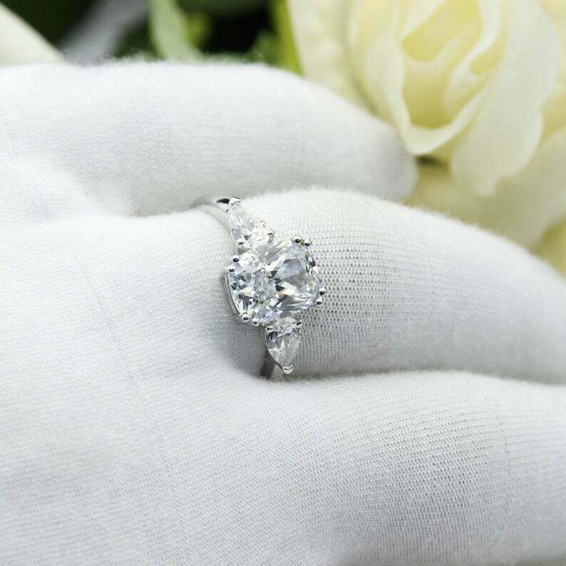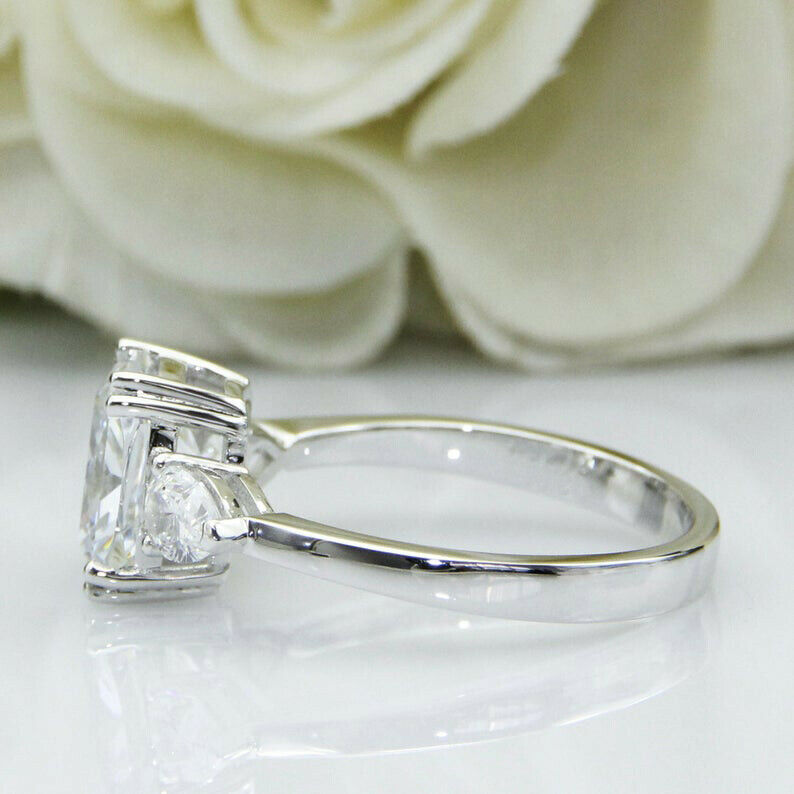 3ct Elongated Cushion Cut Diamond Engagement Ring Trilogy 14k White Gold Finish