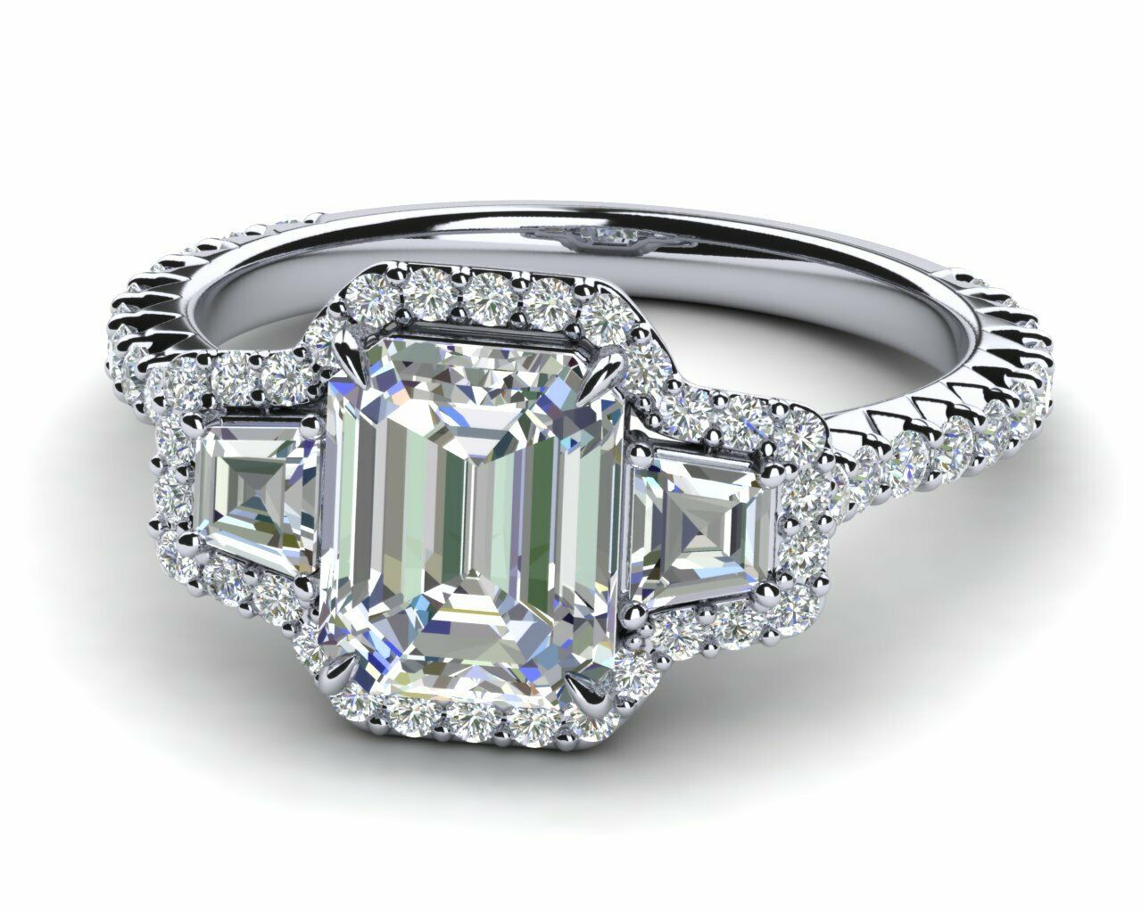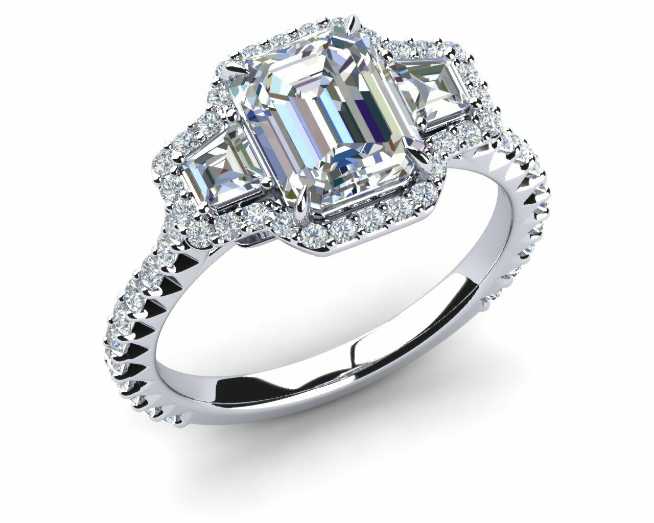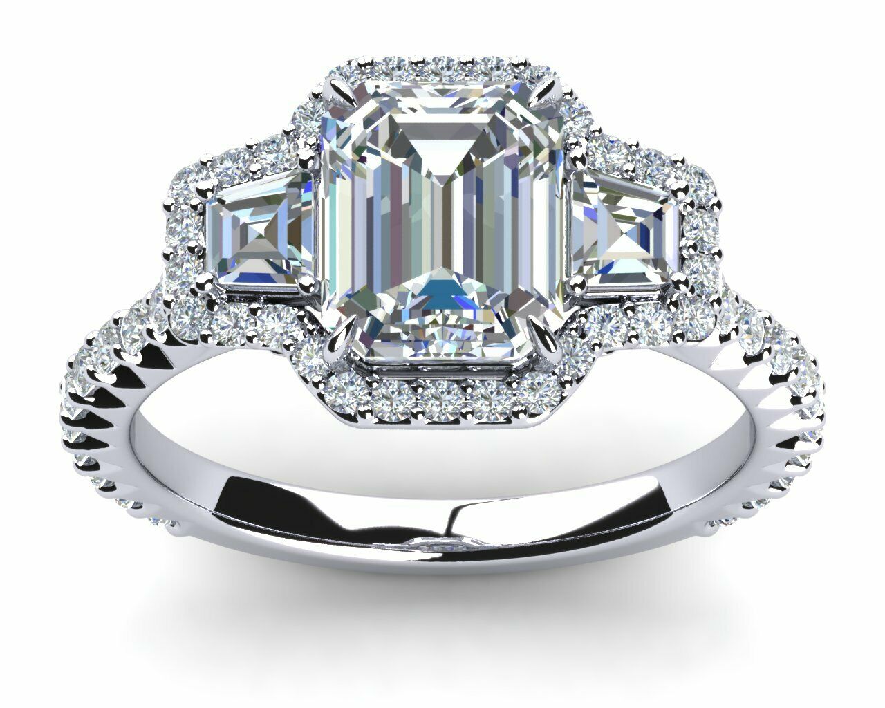 3ct Emerald Cut Diamond 3 Stone Halo Fancy Engagement Ring 14k White Gold Finish