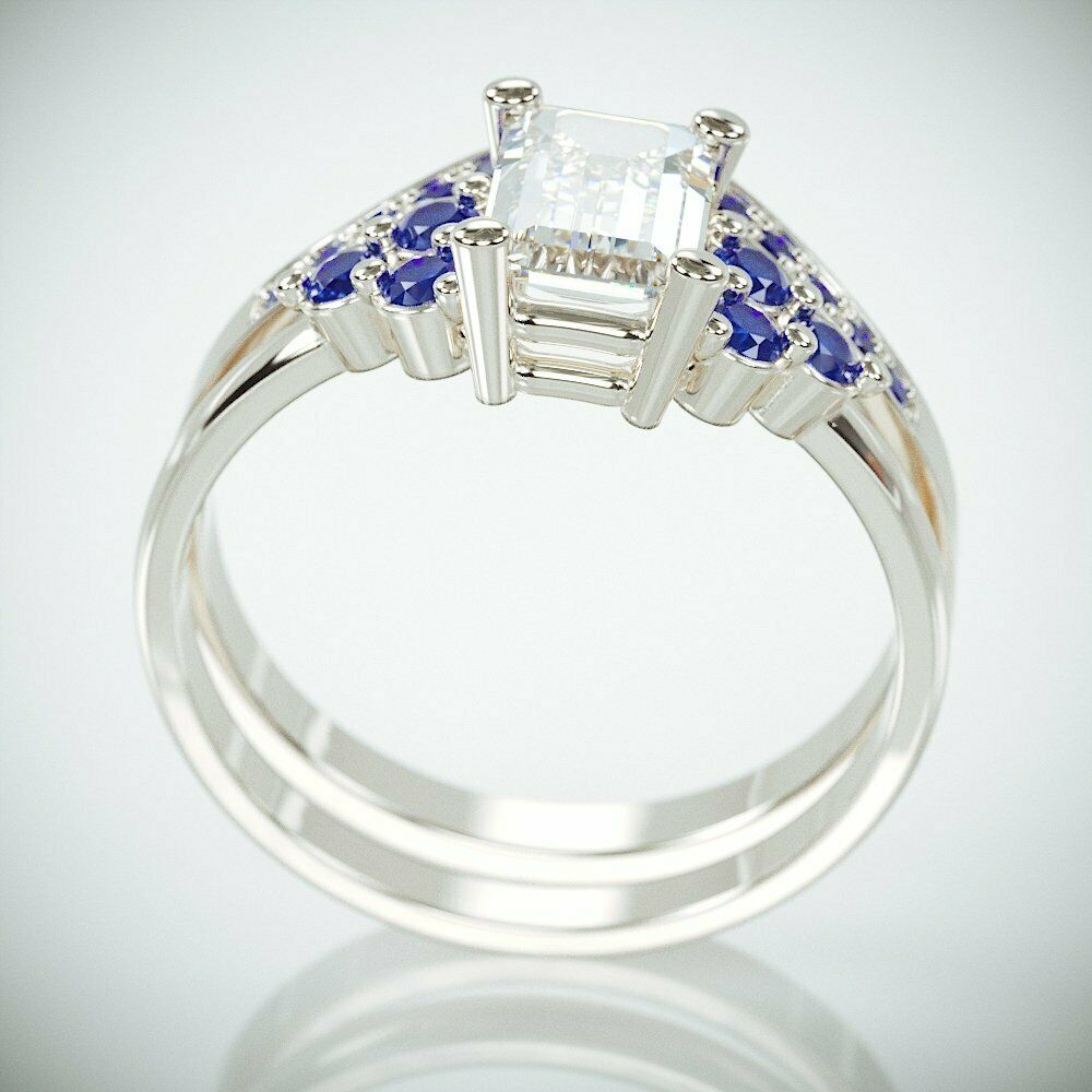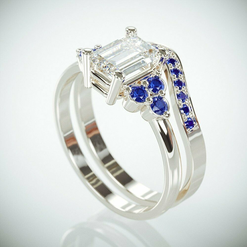3Ct Emerald Cut Diamond Blue Sapphire Accent Band Bridal Set 14K White Gold Over