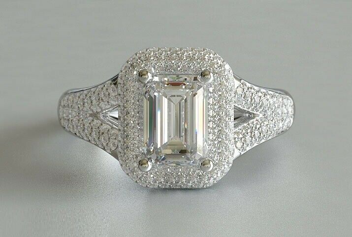 3ct Emerald Cut Diamond Engagement Ring Pave Split Shank 14k White Gold Finish