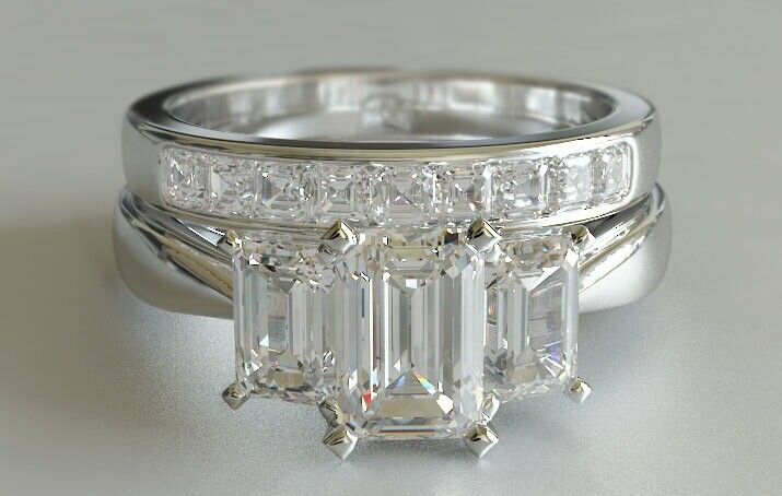 3ct Emerald Cut Diamond Engagement Ring Trilogy Bridal Set 14k White Gold Finish