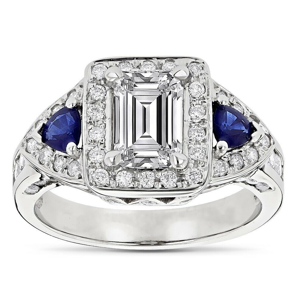 3Ct Emerald Cut Diamond Sapphire Accent Halo Engagement Ring 14K White Gold Over