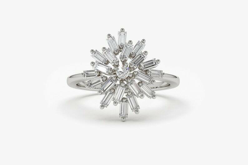 3ct Engagement Ring Baguette Cut Diamond Floral Sunburst 14k White Gold Finish