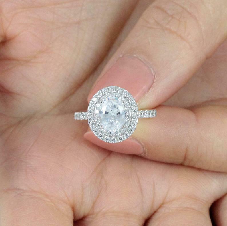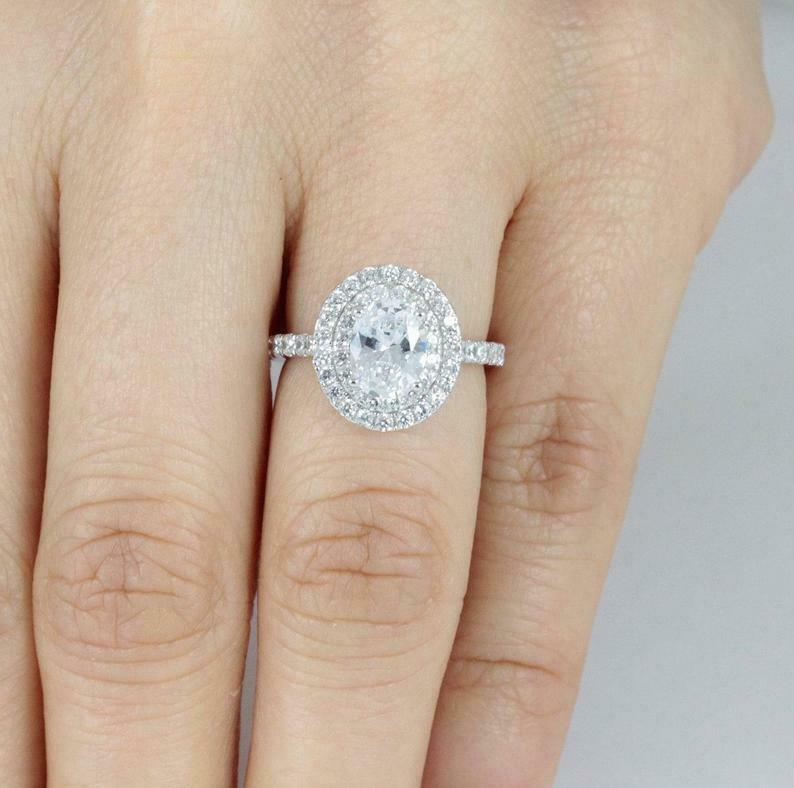 3ct Oval Cut Diamond Engagement Ring Round Accents Dual Halo 14k White Gold Over