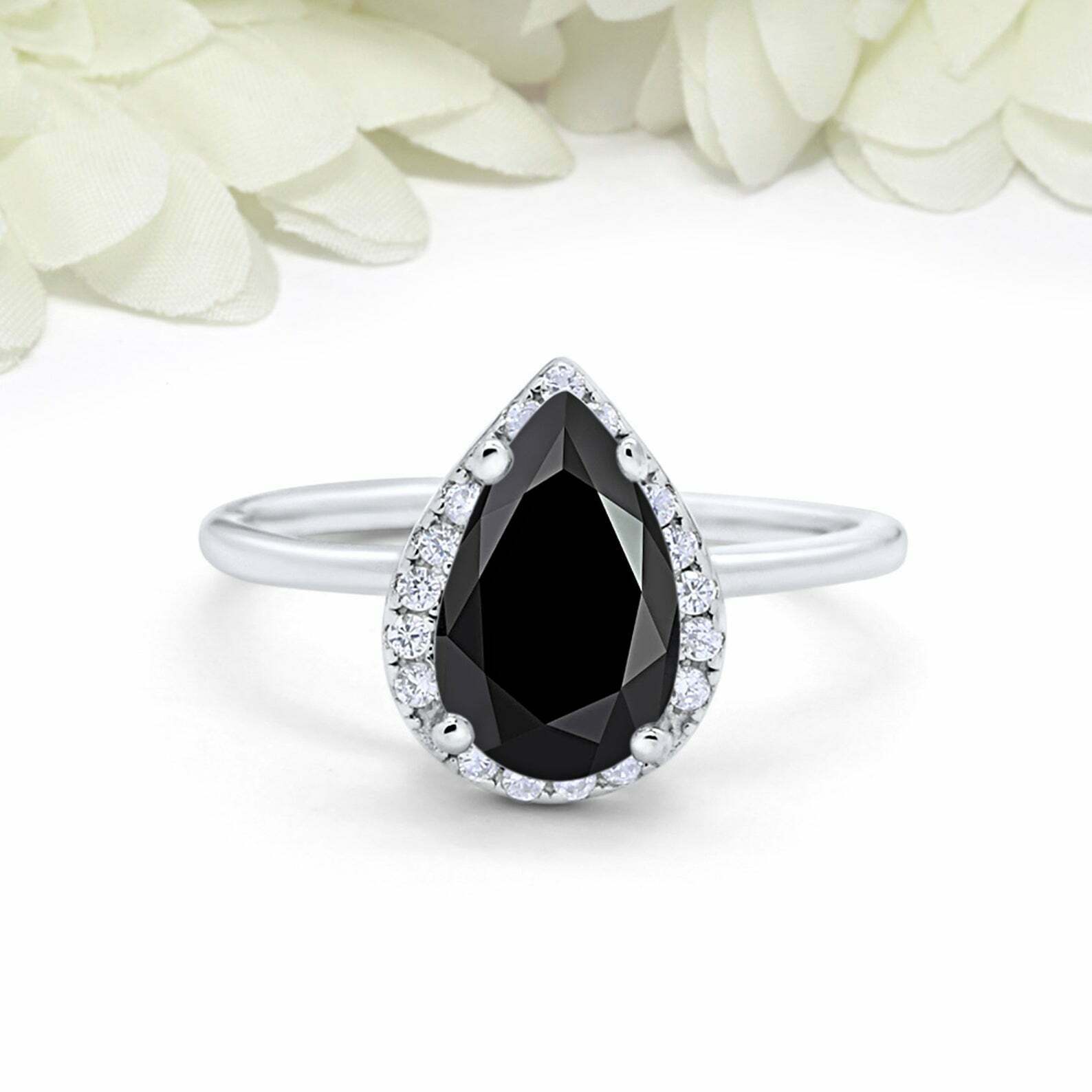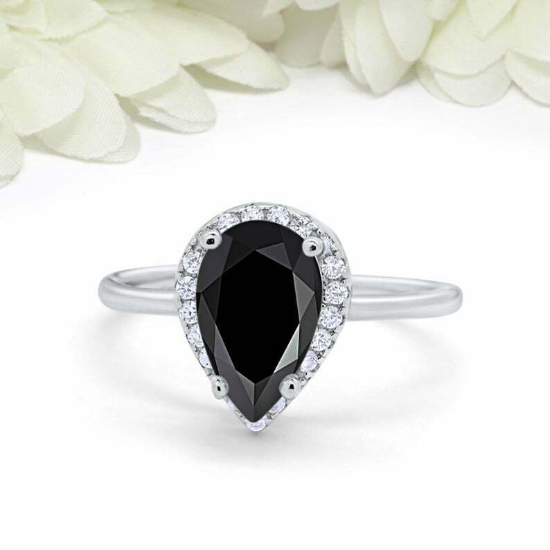 3ct Pear Cut Black Diamond Engagement Ring Halo Minimalist 14k White Gold Finish