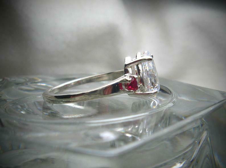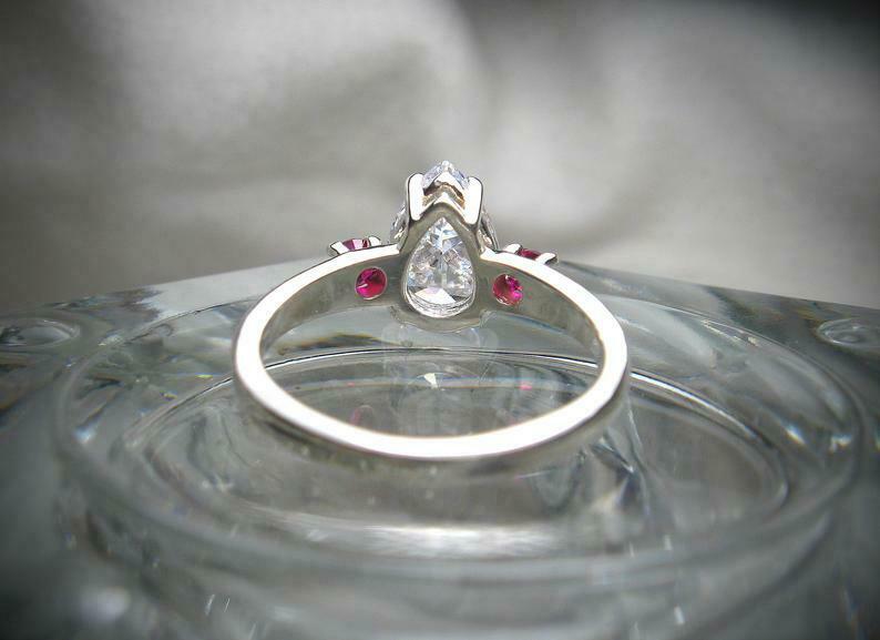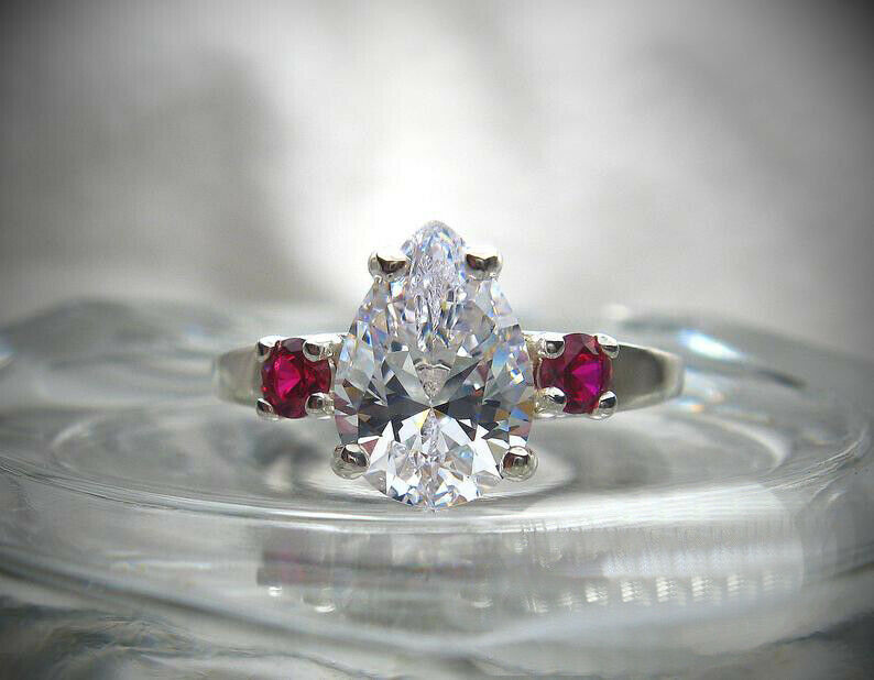 3ct Pear Cut Diamond Trilogy Engagement Ring 14k White Gold Over Ruby Round Accents