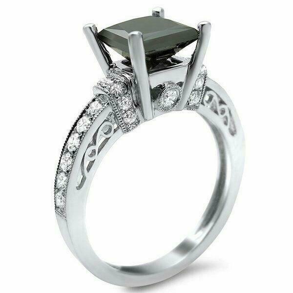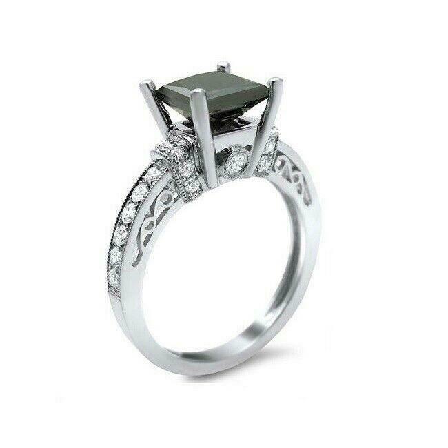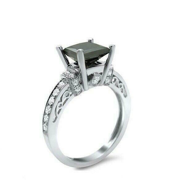 3ct Princess Cut Black Diamond Vintage Engagement Ring 14K White Gold Finish
