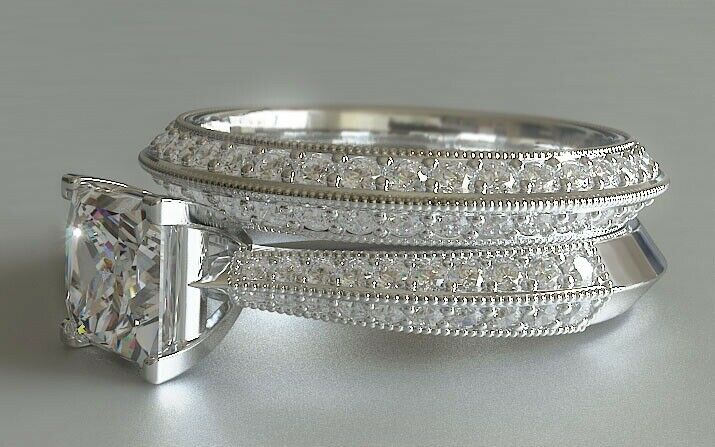 3ct Princess Cut Diamond Engagement Ring Milgrain Bridal Set 14k White Gold Over