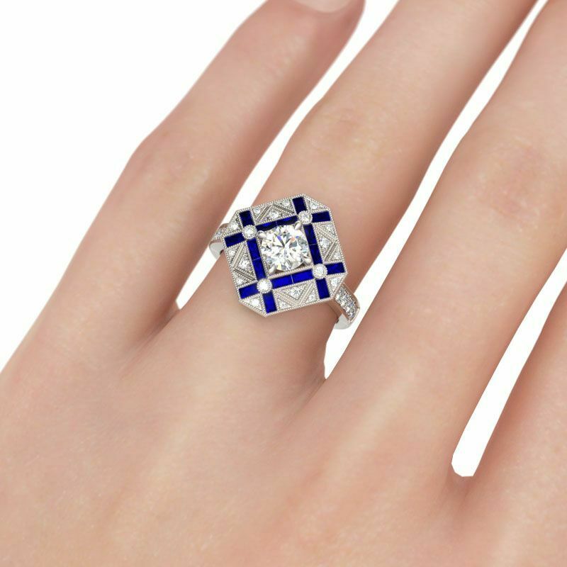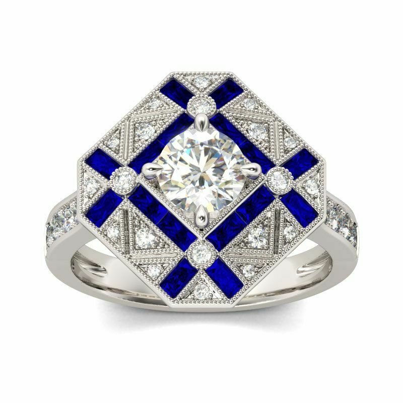 3Ct Round Cut Diamond Blue Sapphire Engagement Art Deco Ring 14K White Gold Over